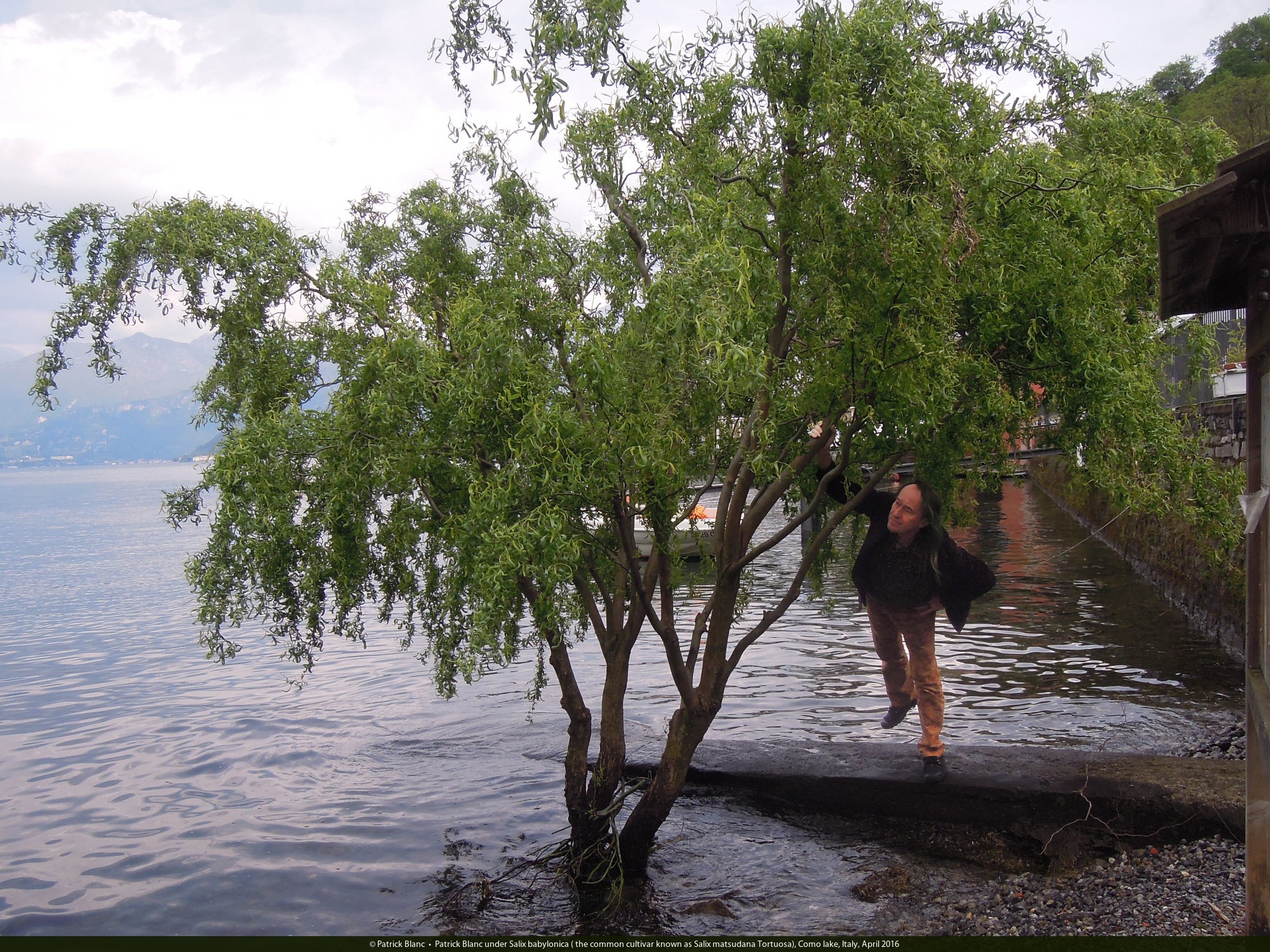 Patrick Blanc under Salix babylonica ( the common cultivar known as Salix matsudana Tortuosa), Como lake, Italy, April 2016