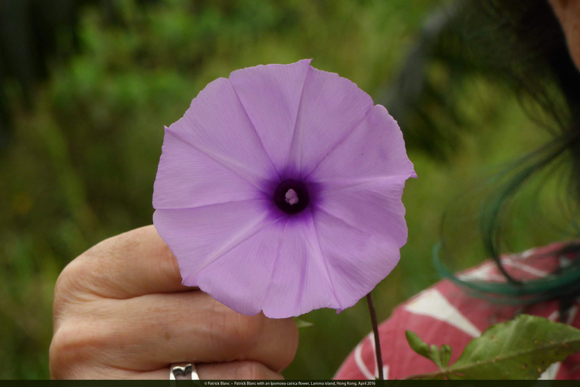 Patrick Blanc with an Ipomoea cairica flower, Lamma island, Hong Kong, April 2016