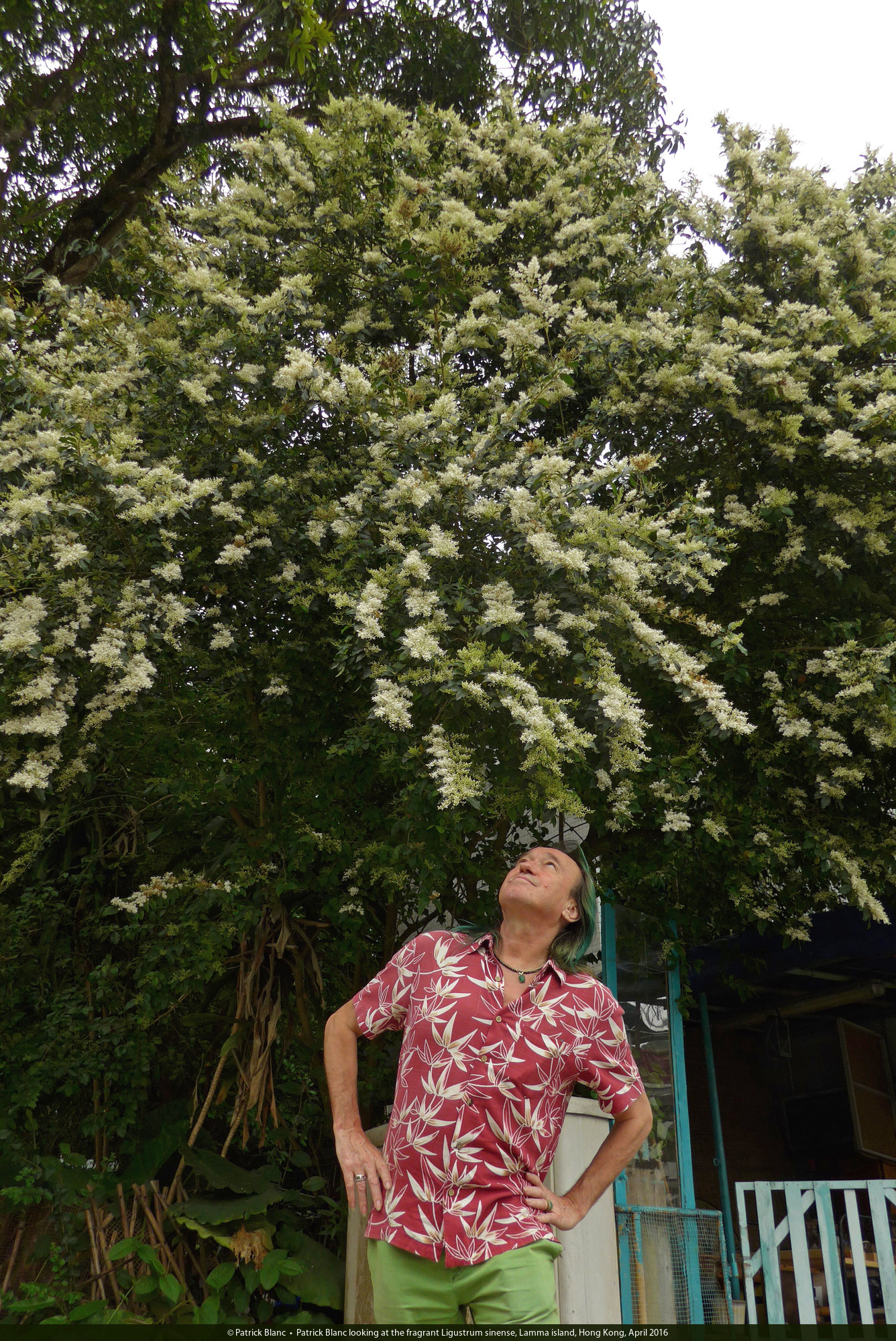 Patrick Blanc looking at the fragrant Ligustrum sinense, Lamma island, Hong Kong, April 2016