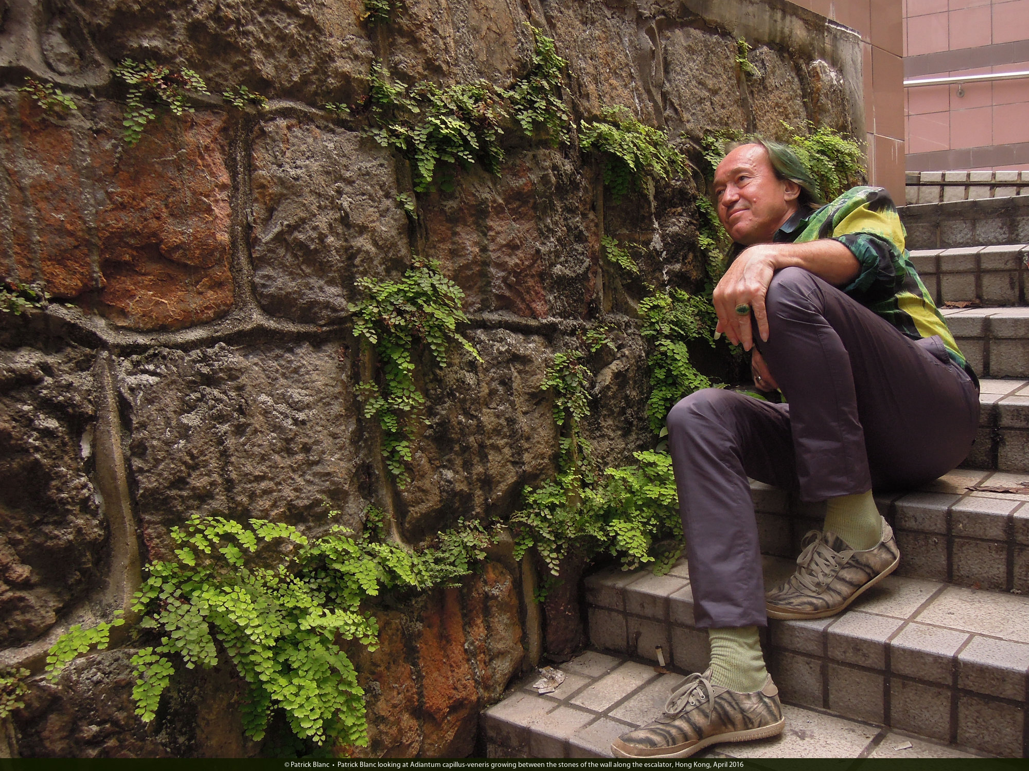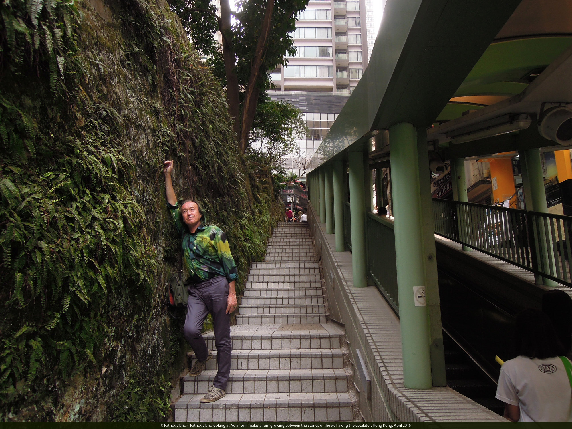 Patrick Blanc looking at Adiantum capillus-veneris growing between the stones of the wall along the escalator, Hong Kong, April 2016