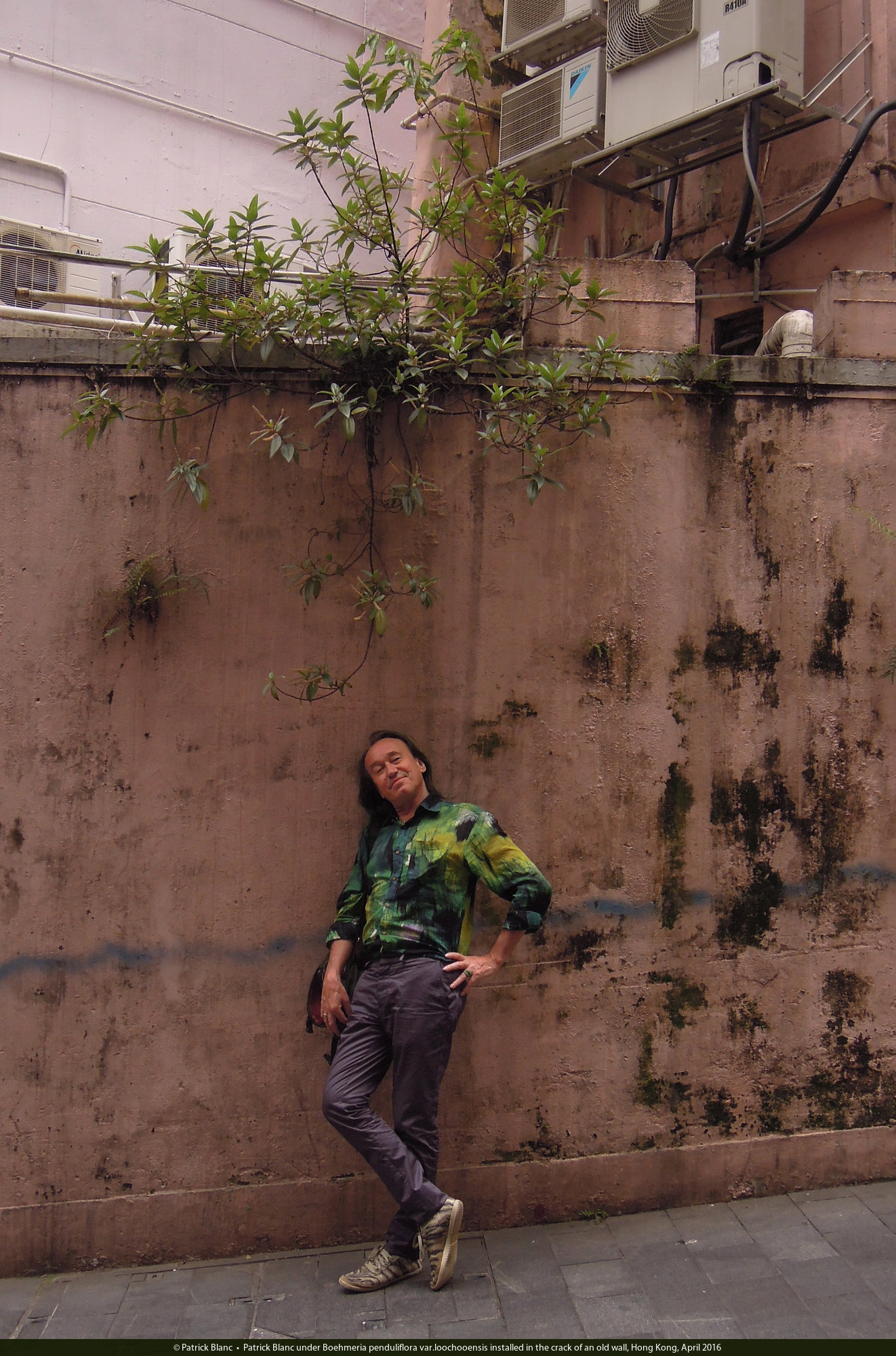Patrick Blanc under Boehmeria penduliflora var.loochooensis installed in the crack of an old wall, Hong Kong, April 2016