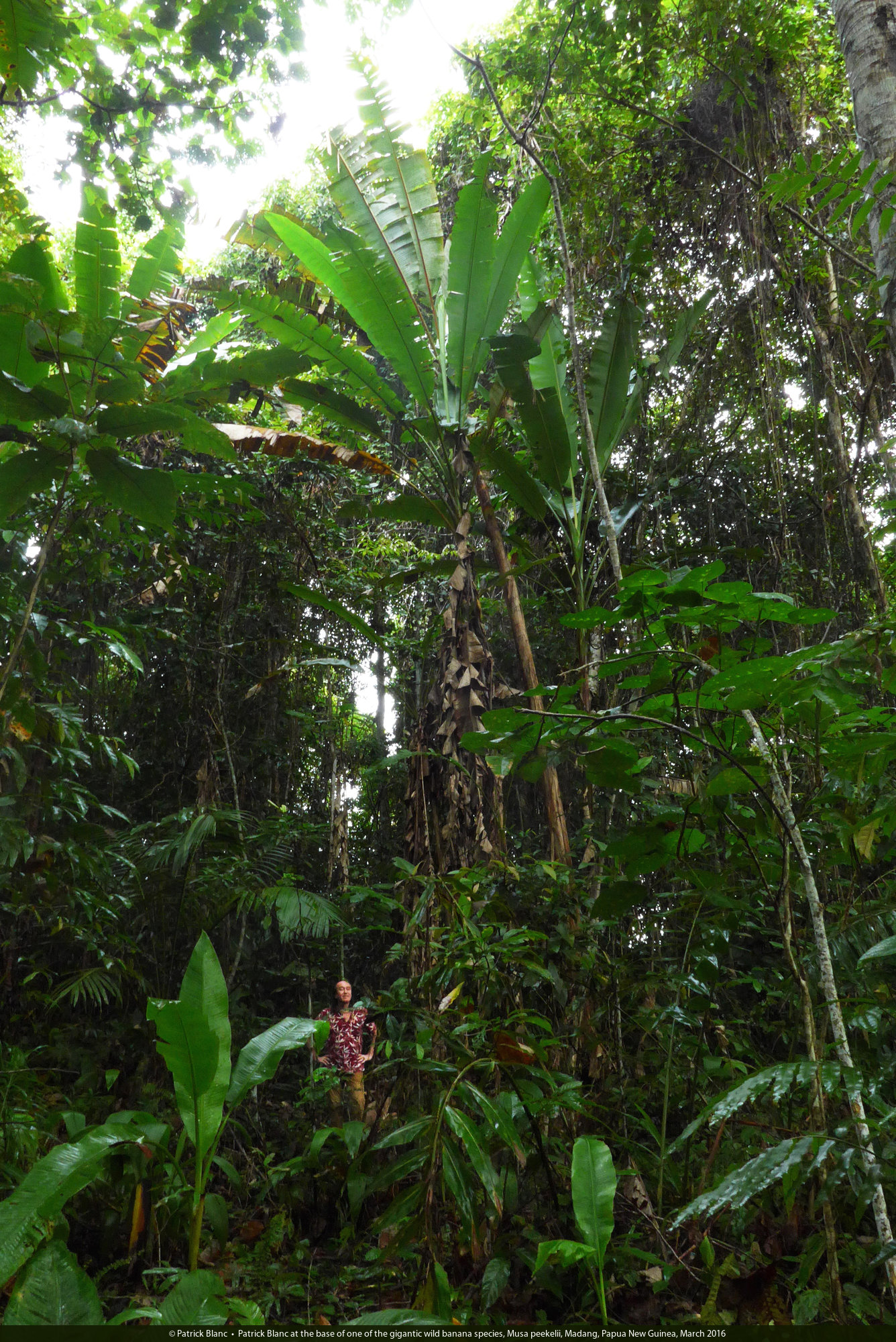 Patrick Blanc at the base of one of the gigantic wild banana species, Musa peekelii, Madang, Papua New Guinea, March 2016