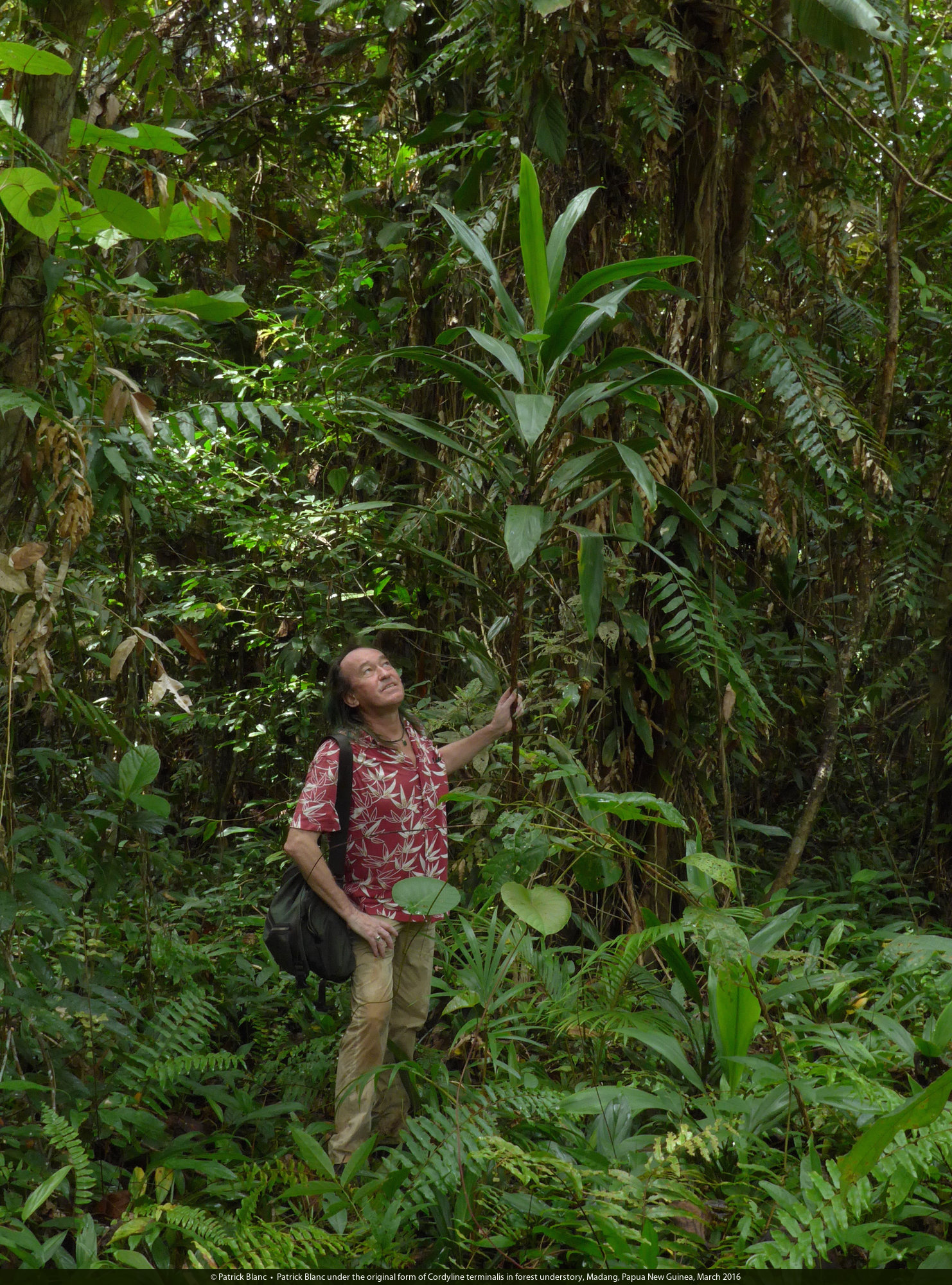 Patrick Blanc under the original form of Cordyline terminalis in forest understory, Madang, Papua New Guinea, March 2016