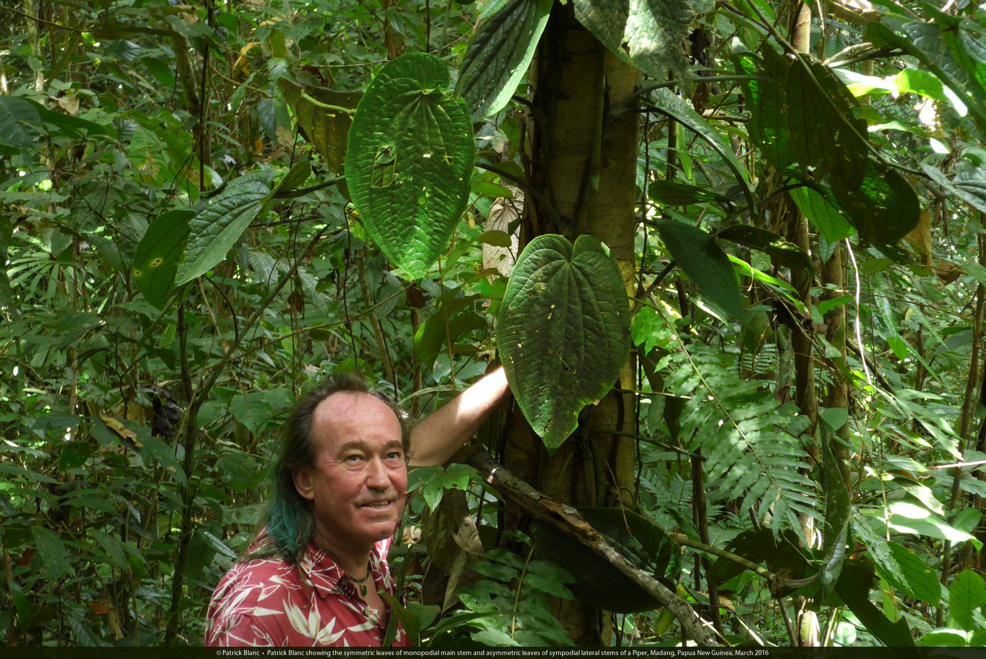Patrick Blanc showing the symmetric leaves of monopodial main stem and asymmetric leaves of sympodial lateral stems of Piper decumanum, Madang, Papua New Guinea, March 2016