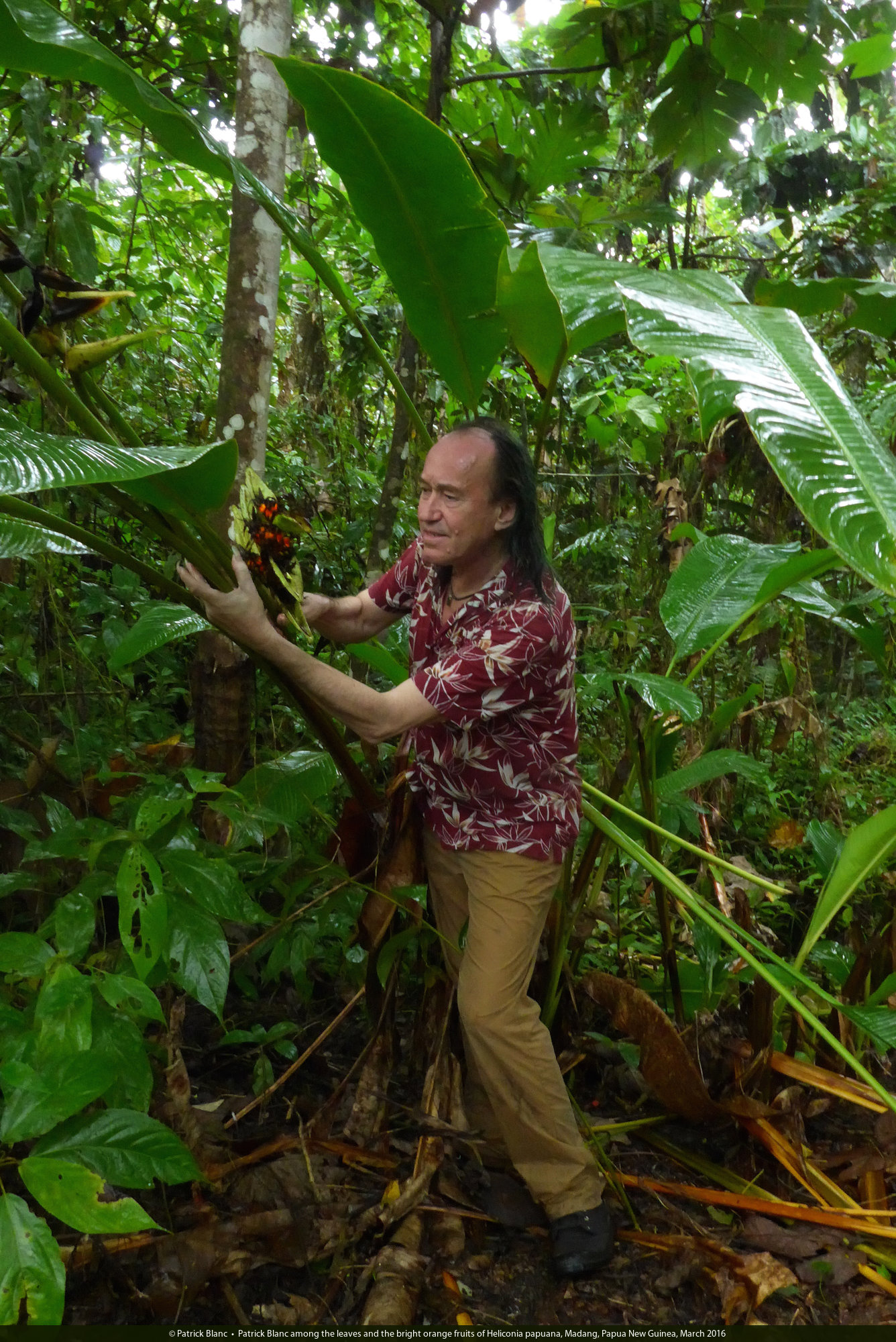 Patrick Blanc among the leaves and the bright orange fruits of Heliconia papuana, Madang, Papua New Guinea, March 2016