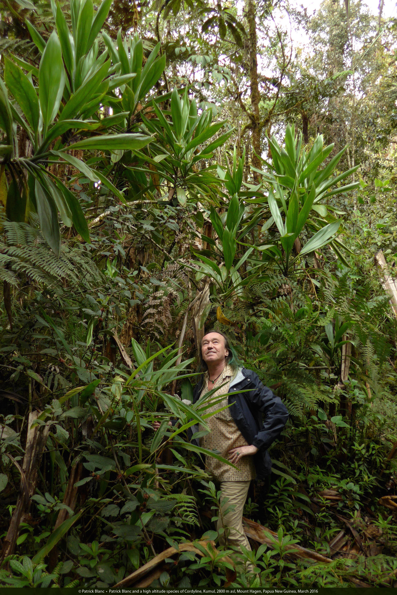 Patrick Blanc and a high altitude species of Cordyline, Kumul, 2800 m asl, Mount Hagen, Papua New Guinea, March 2016