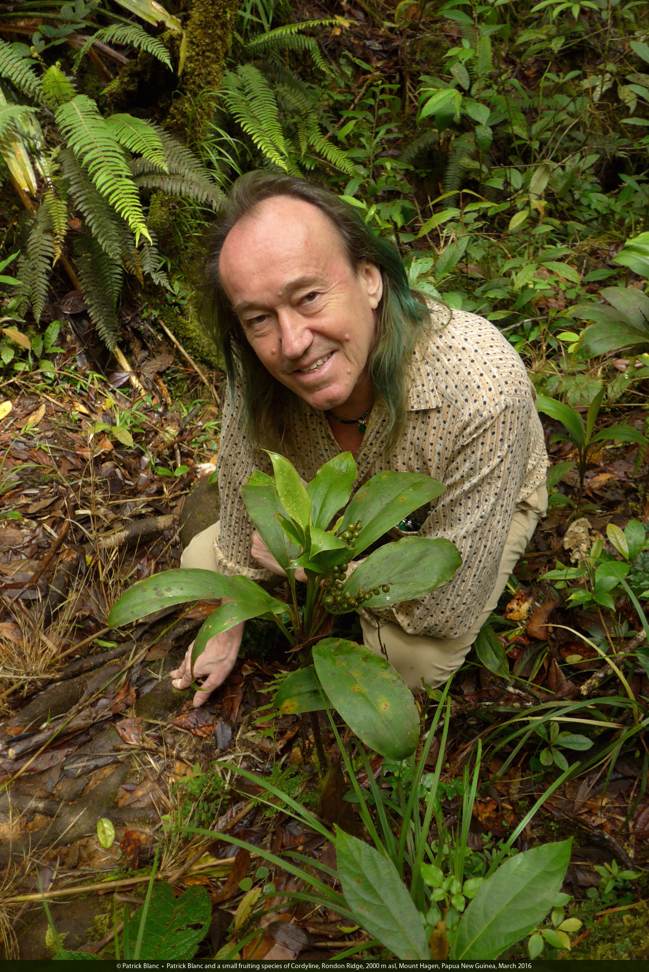 Patrick Blanc and a small fruiting species of Cordyline, Rondon Ridge, 2000 m asl, Mount Hagen, Papua New Guinea, March 2016