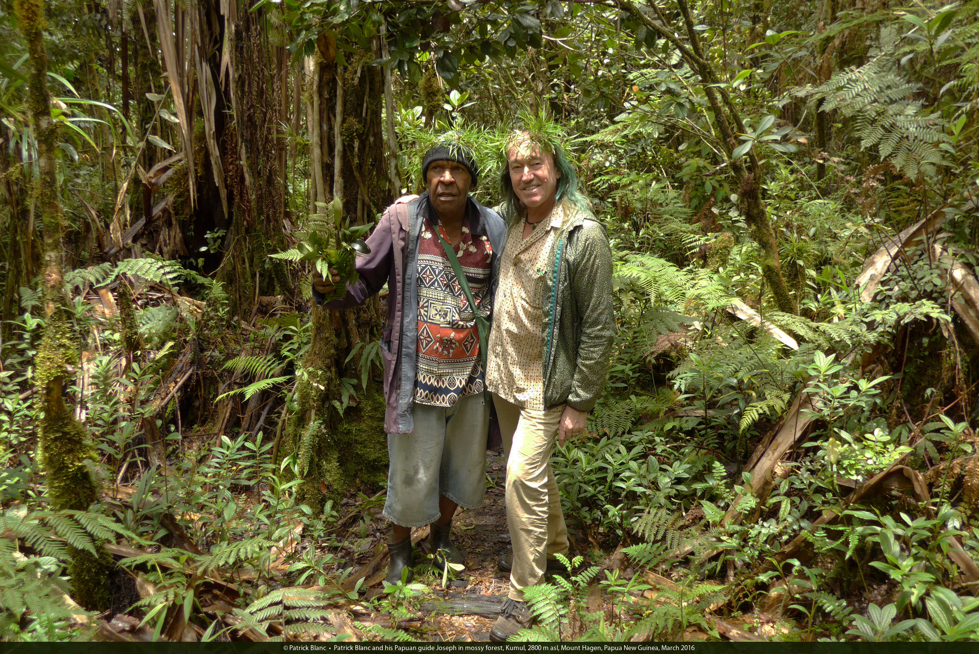 Patrick Blanc and his Papuan guide Joseph in mossy forest, Kumul, 2800 m asl, Mount Hagen, Papua New Guinea, March 2016