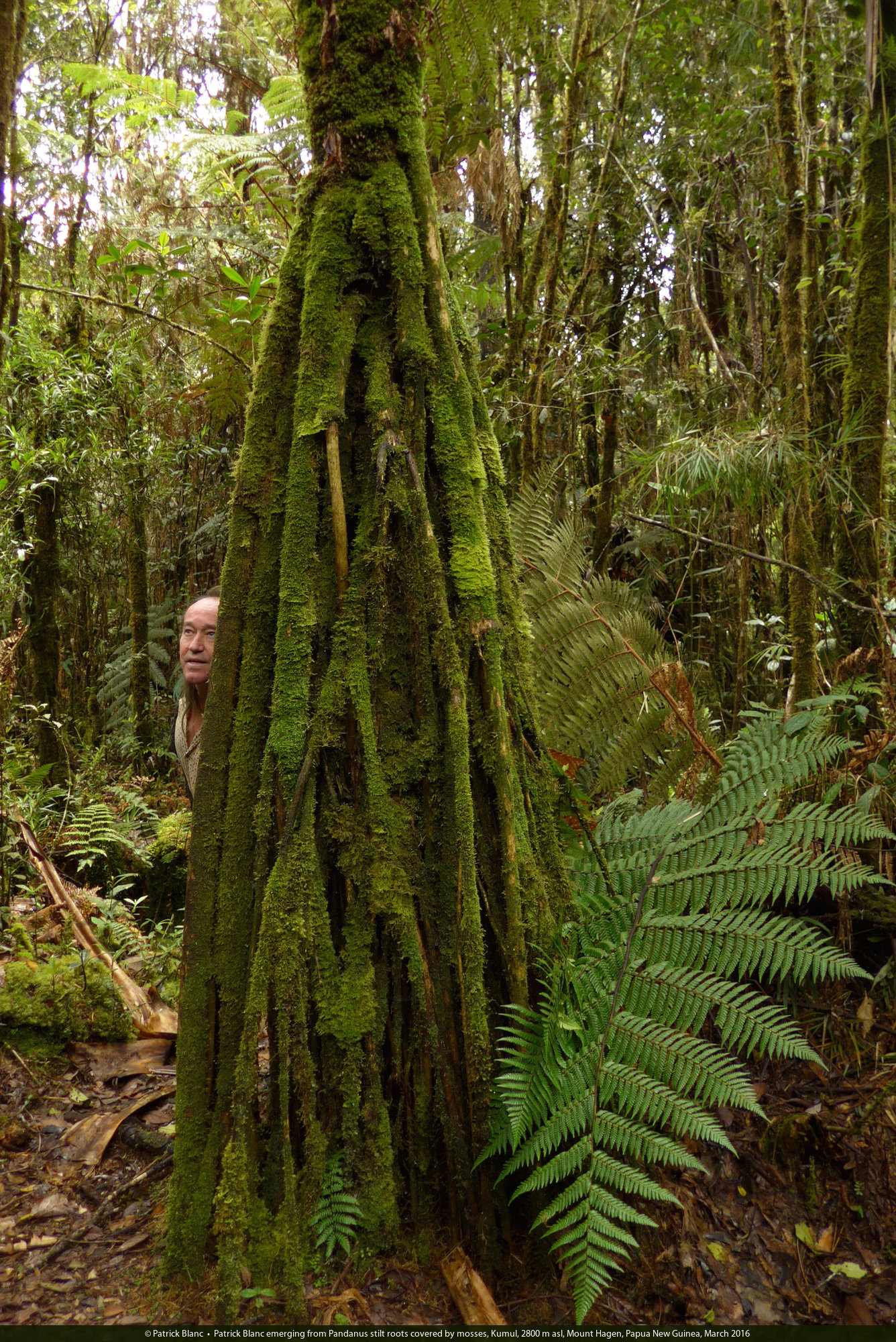 Patrick Blanc emerging from Pandanus stilt roots covered by mosses, Kumul, 2800 m asl, Mount Hagen, Papua New Guinea, March 2016