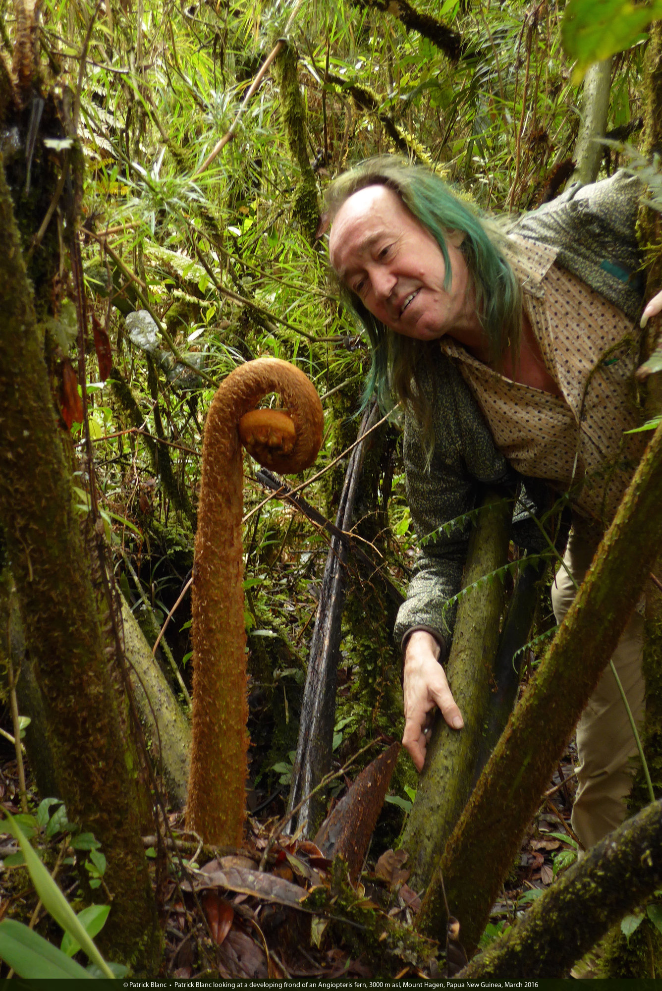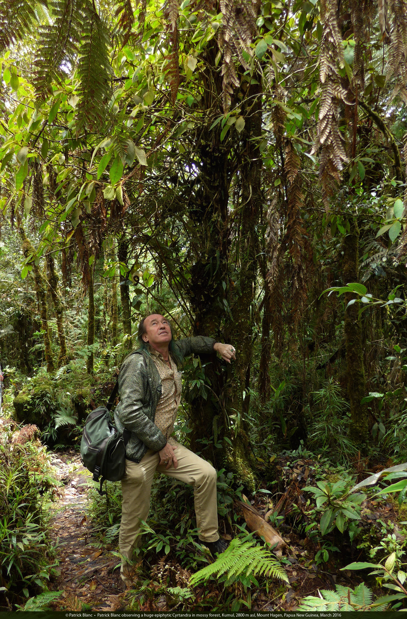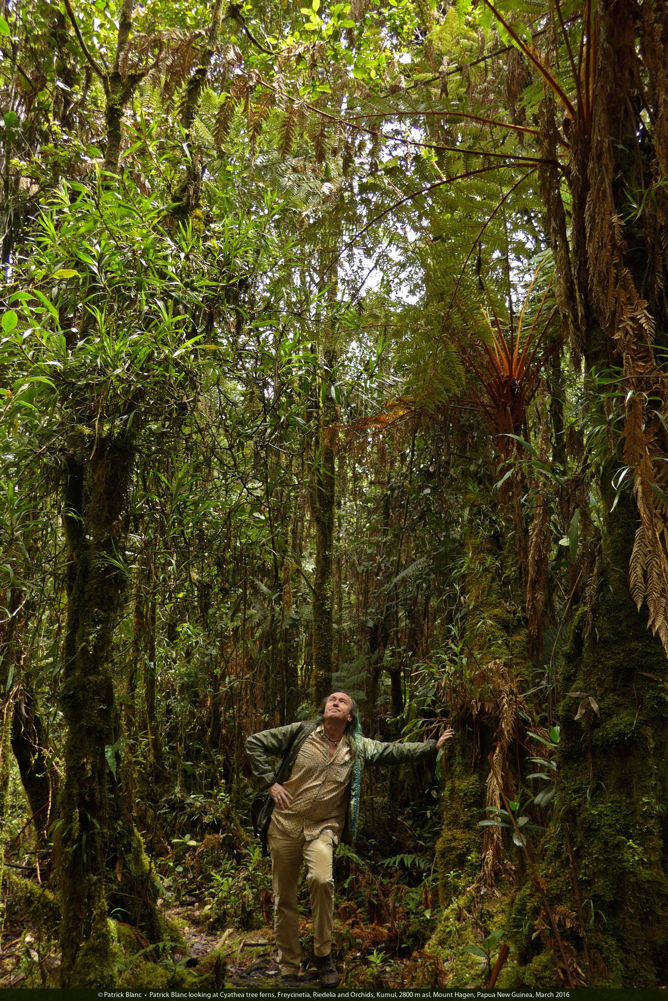 Patrick Blanc in mossy forest, Kumul, 2800 m asl, Mount Hagen, Papua New Guinea, March 2016