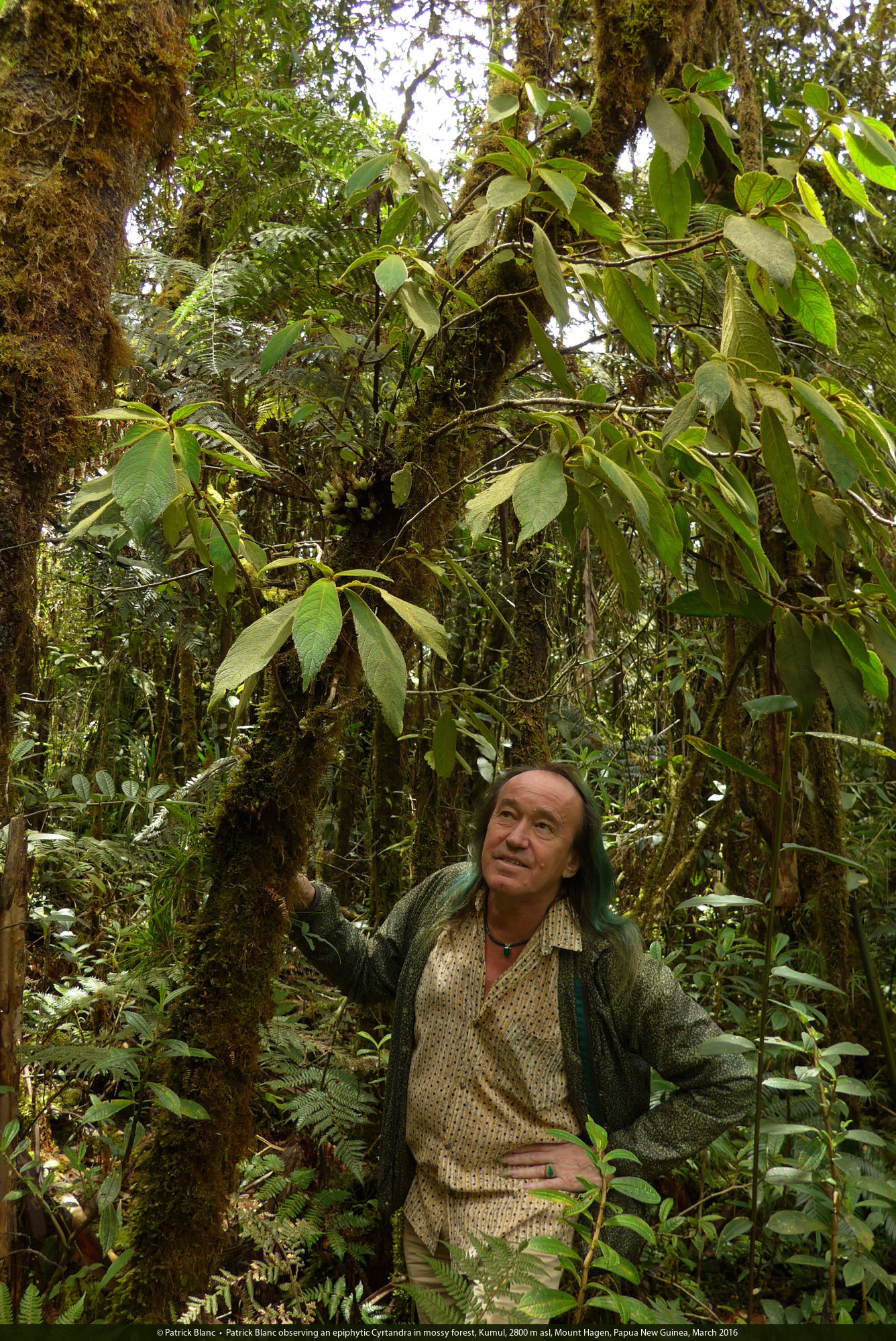 Patrick Blanc observing a huge epiphytic Cyrtandra in mossy forest, Kumul, 2800 m asl, Mount Hagen, Papua New Guinea, March 2016
