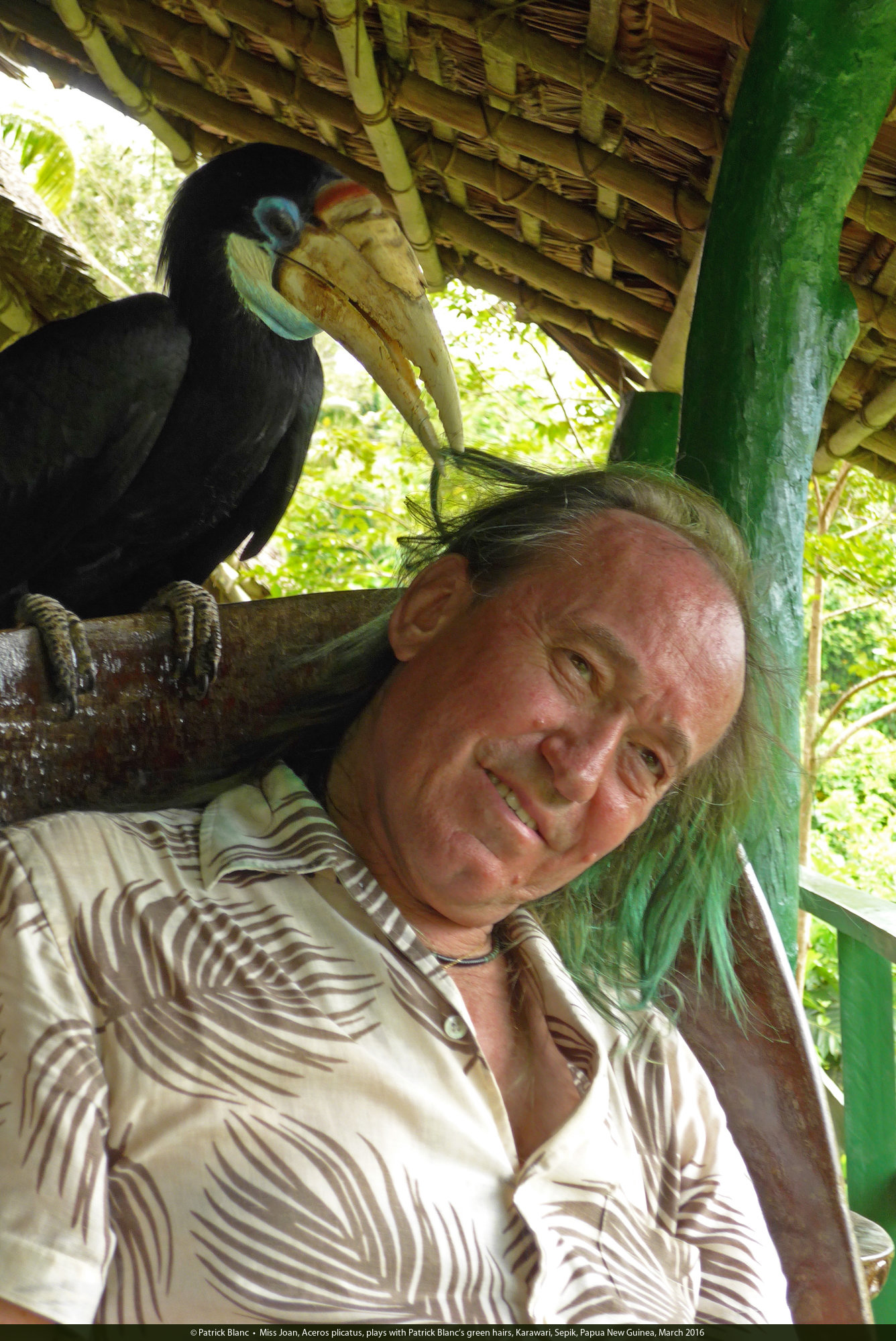 Miss Joan, Aceros plicatus, plays with Patrick Blanc's green hairs, Karawari, Sepik, Papua New Guinea, March 2016