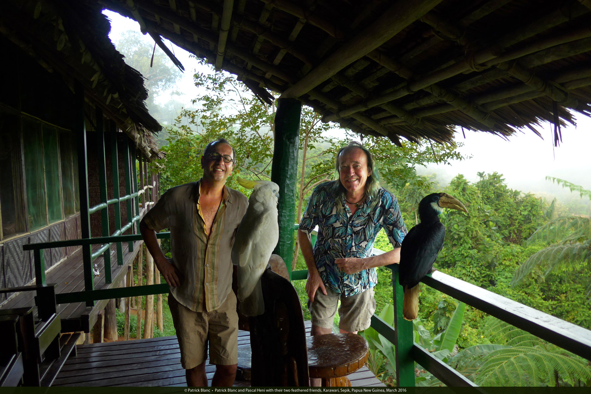 Patrick Blanc and Pascal Heni with their two feathered friends, Karawari, Sepik, Papua New Guinea, March 2016