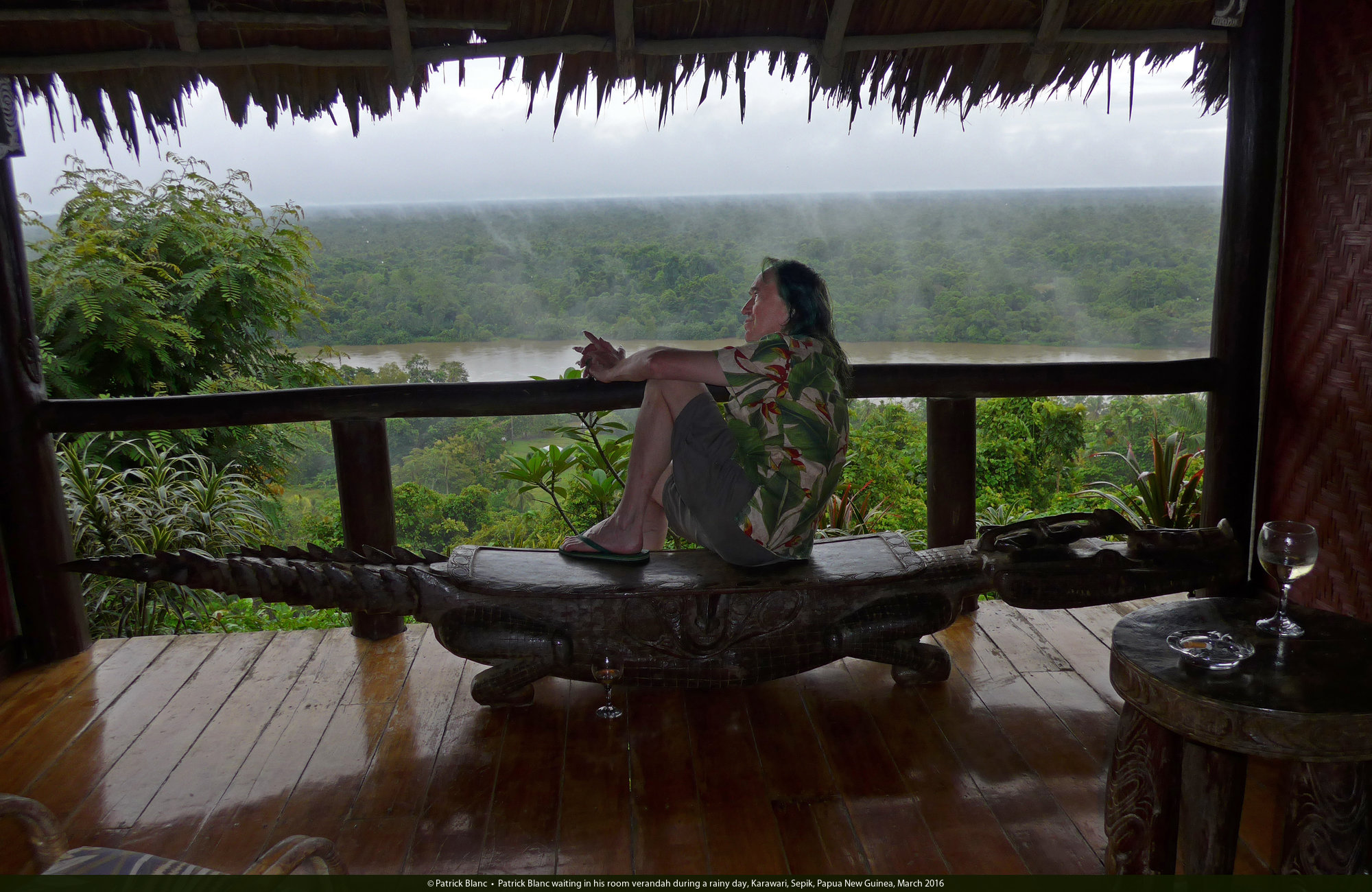 Patrick Blanc waiting in his room verandah during a rainy day, Karawari, Sepik, Papua New Guinea, March 2016