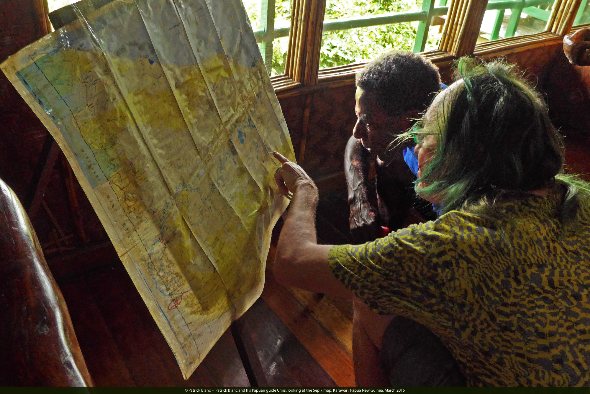 Patrick Blanc and his Papuan guide Chris, looking at the Sepik map, Karawari, Papua New Guinea, March 2016