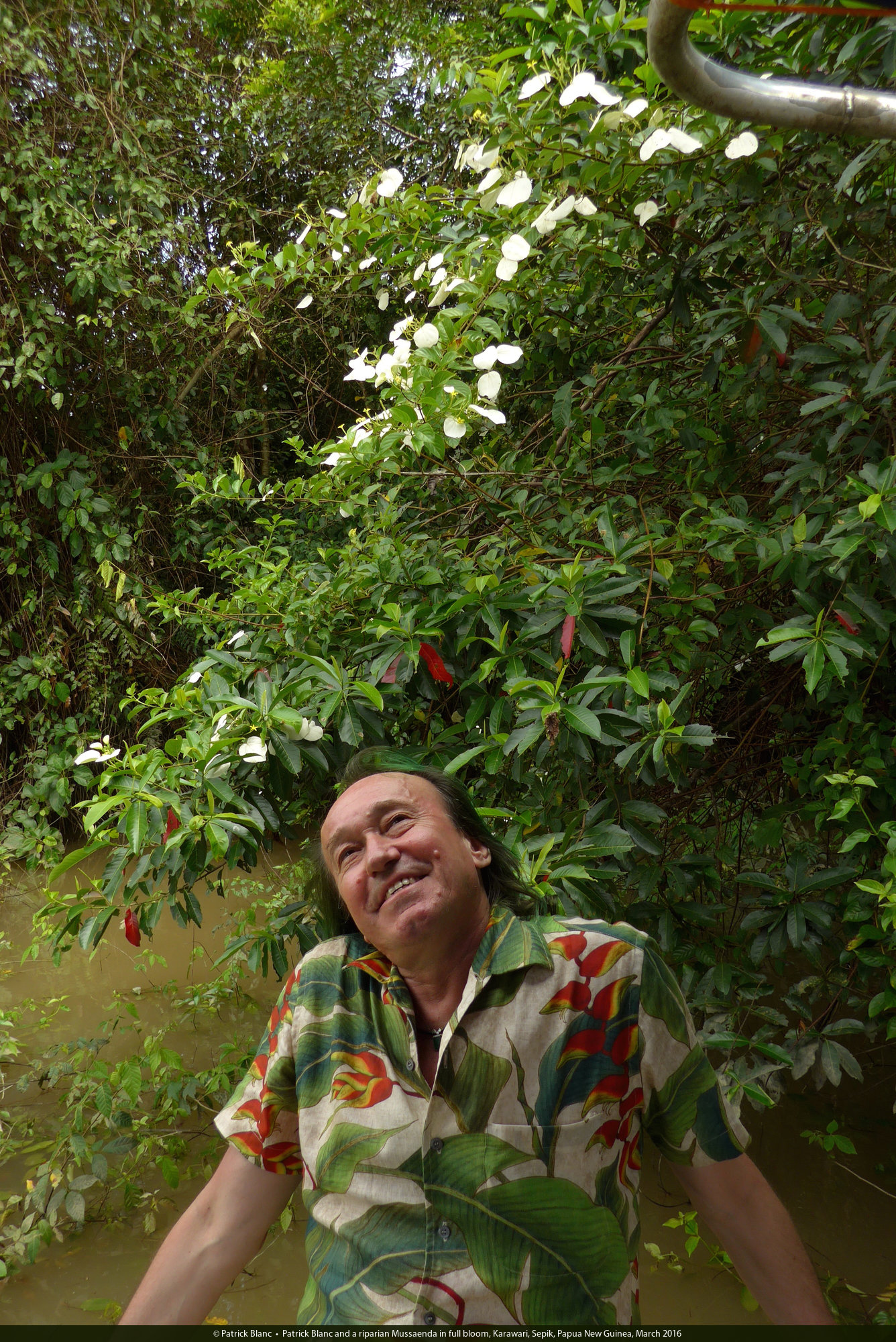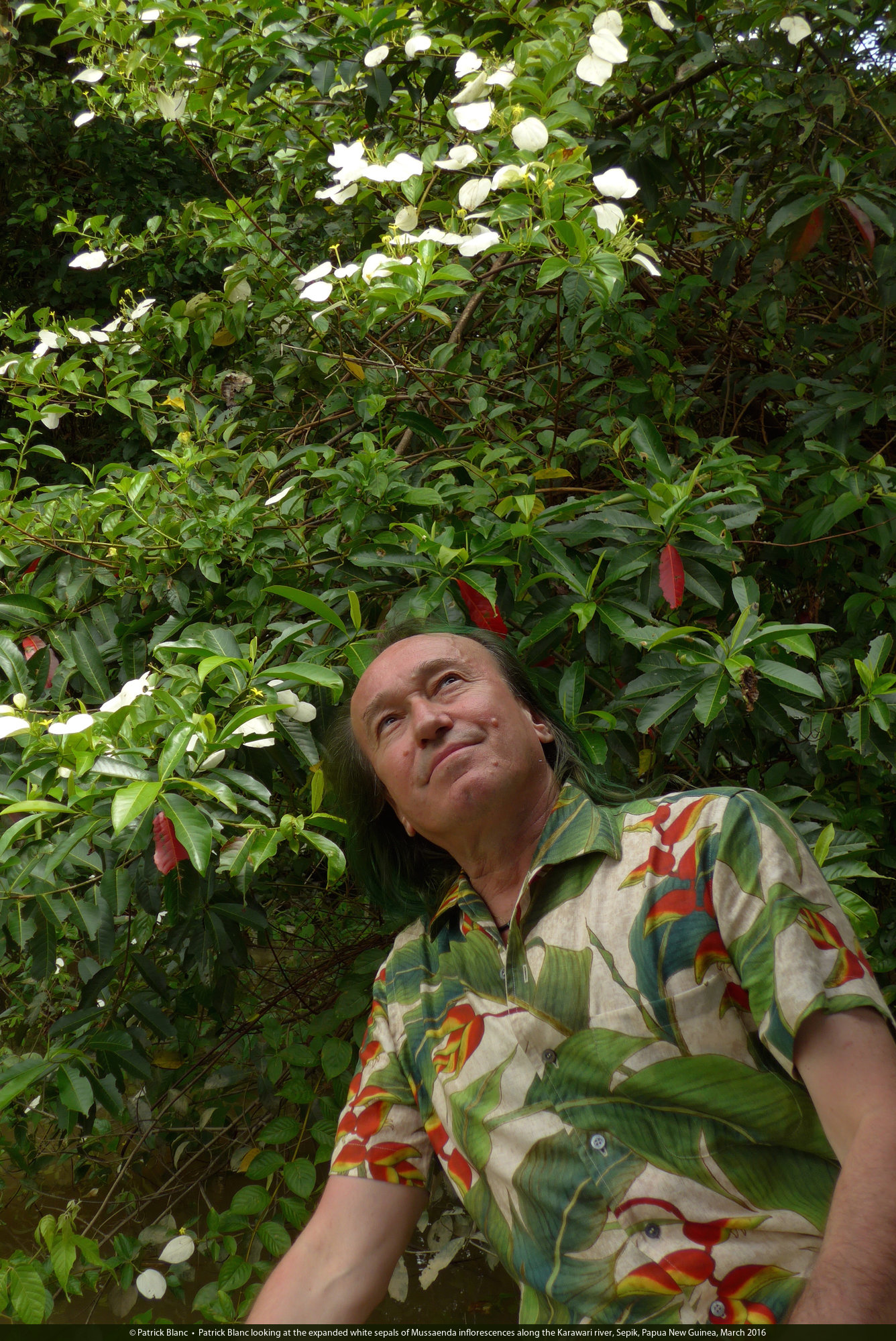 Patrick Blanc and the riparian Mussaenda aestuarii in full bloom, Karawari, Sepik, Papua New Guinea, March 2016