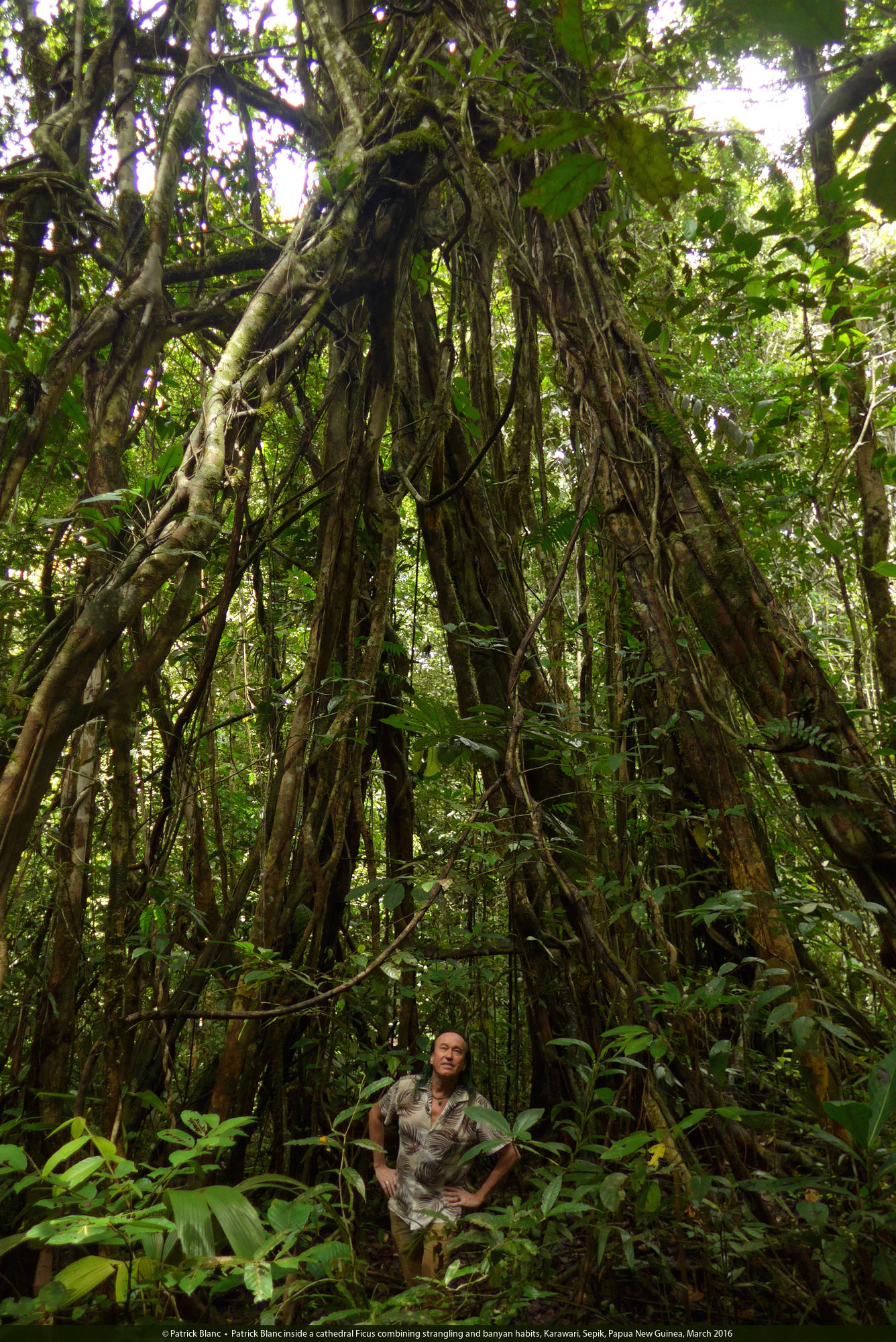Patrick Blanc inside a cathedral Ficus combining strangling and banyan habits, Karawari, Sepik, Papua New Guinea, March 2016
