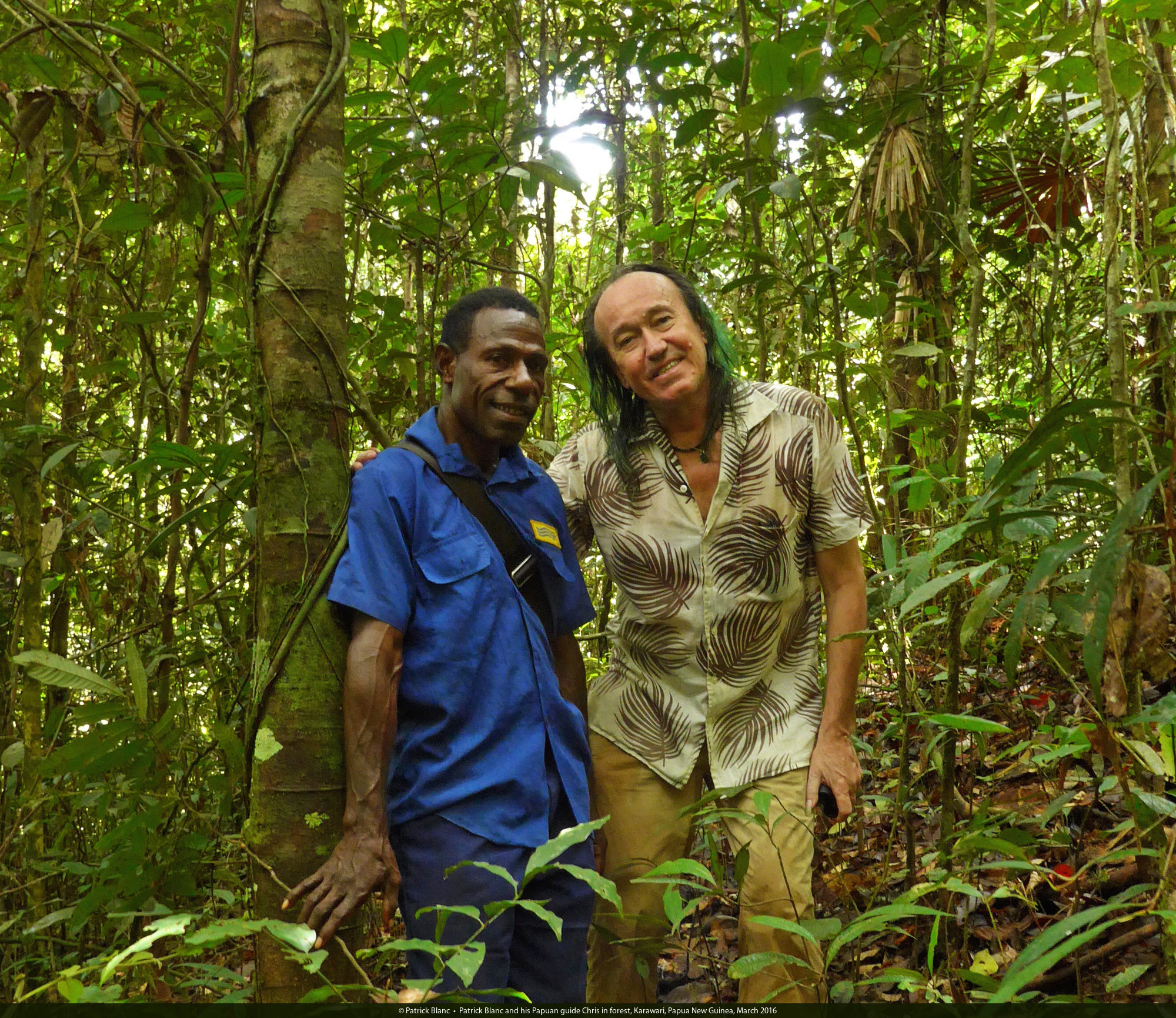 Patrick Blanc and his Papuan guide Chris in forest, Karawari, Papua New Guinea, March 2016