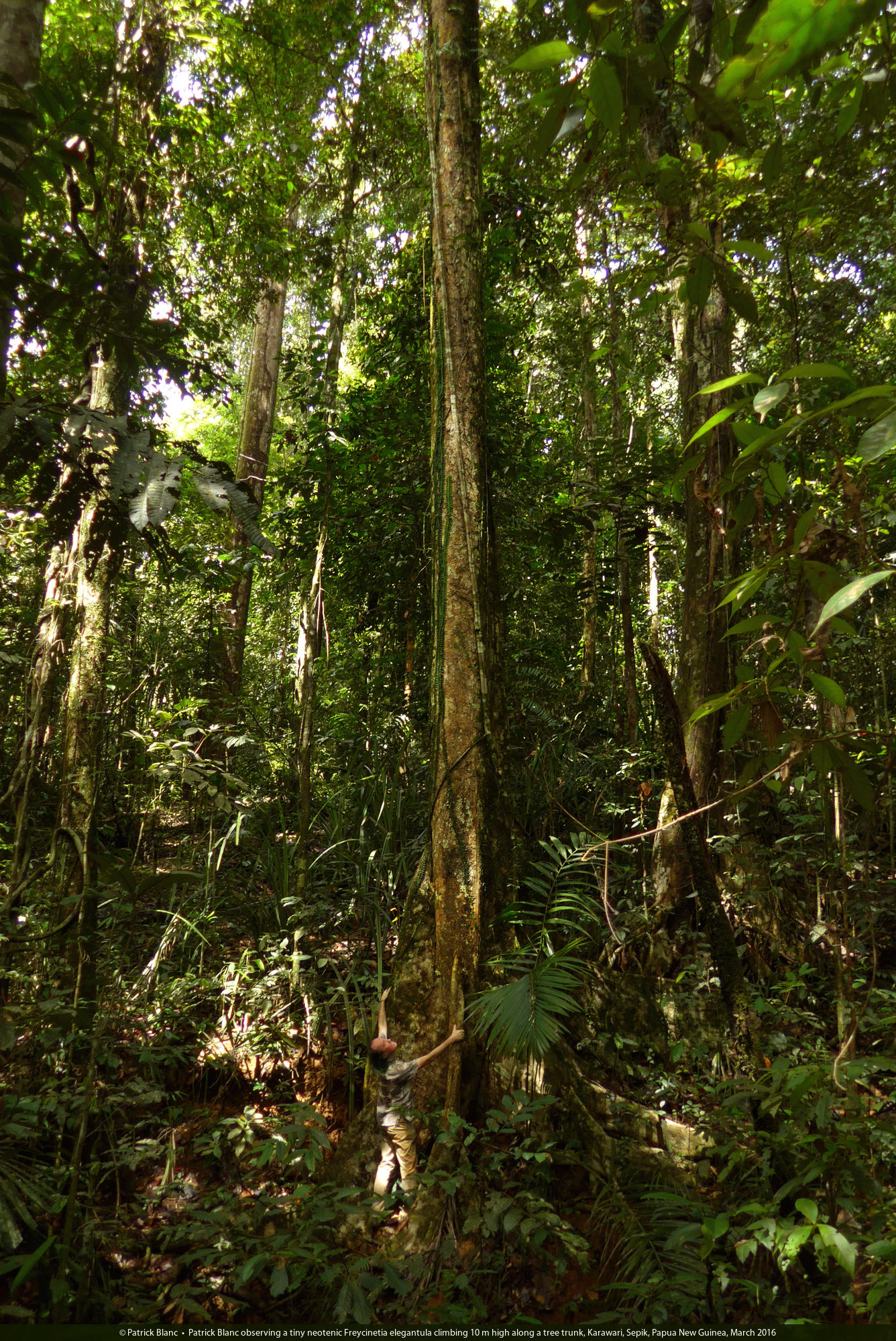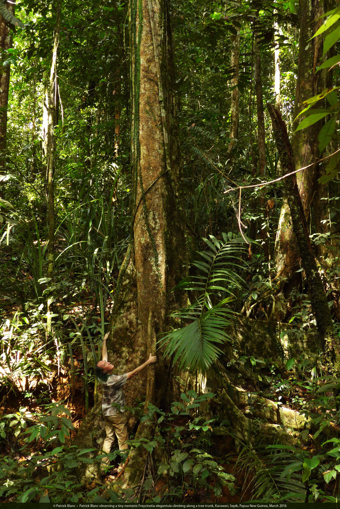Patrick Blanc observing a tiny neotenic Freycinetia elegantula climbing 10 m high along a tree trunk, Karawari, Sepik, Papua New Guinea, March 2016