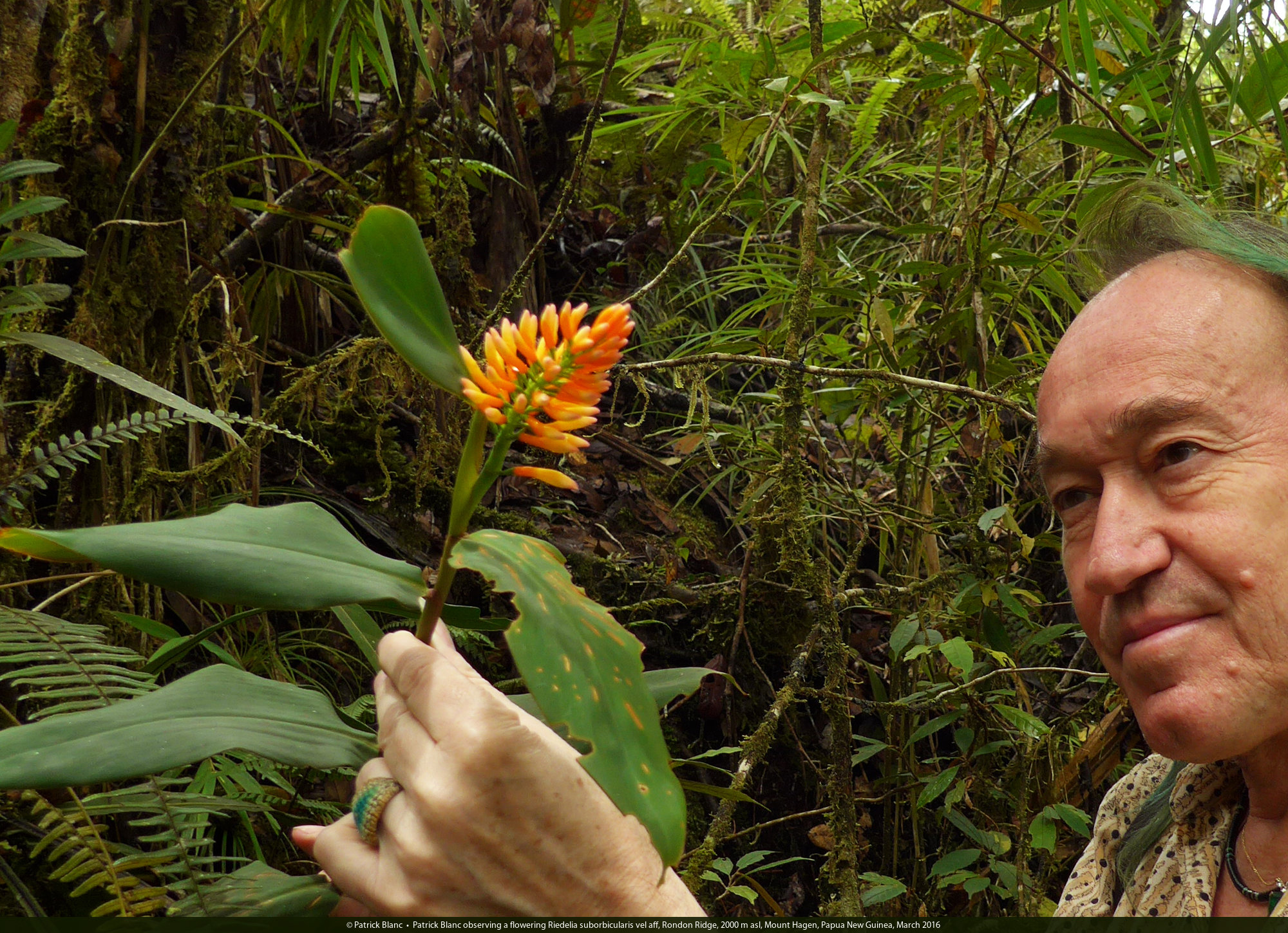 Patrick Blanc observing a flowering Riedelia suborbicularis vel aff, Rondon Ridge, 2000 m asl, Mount Hagen, Papua New Guinea, March 2016