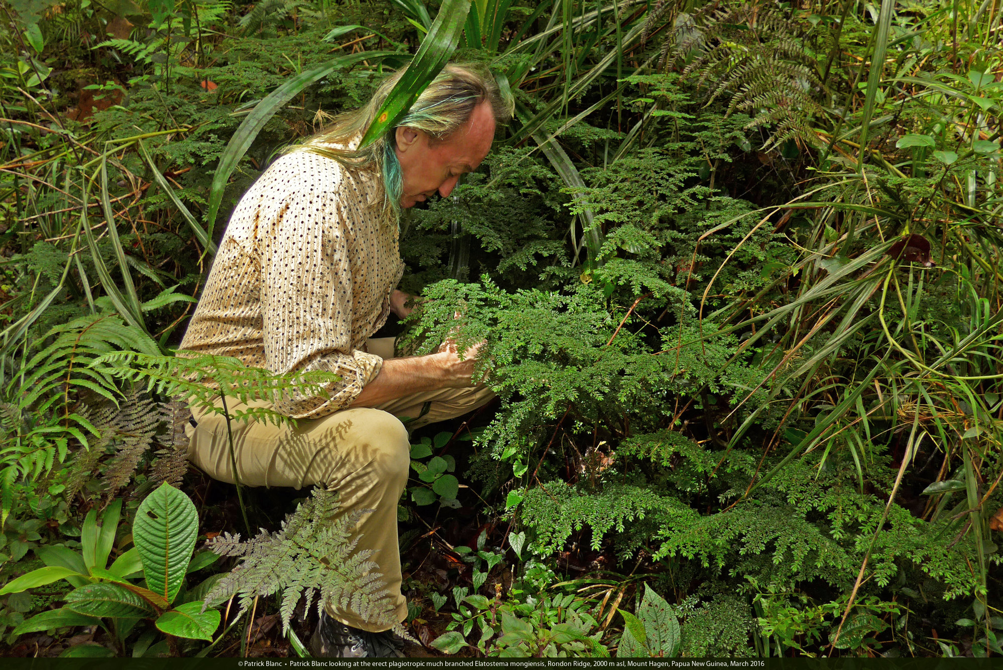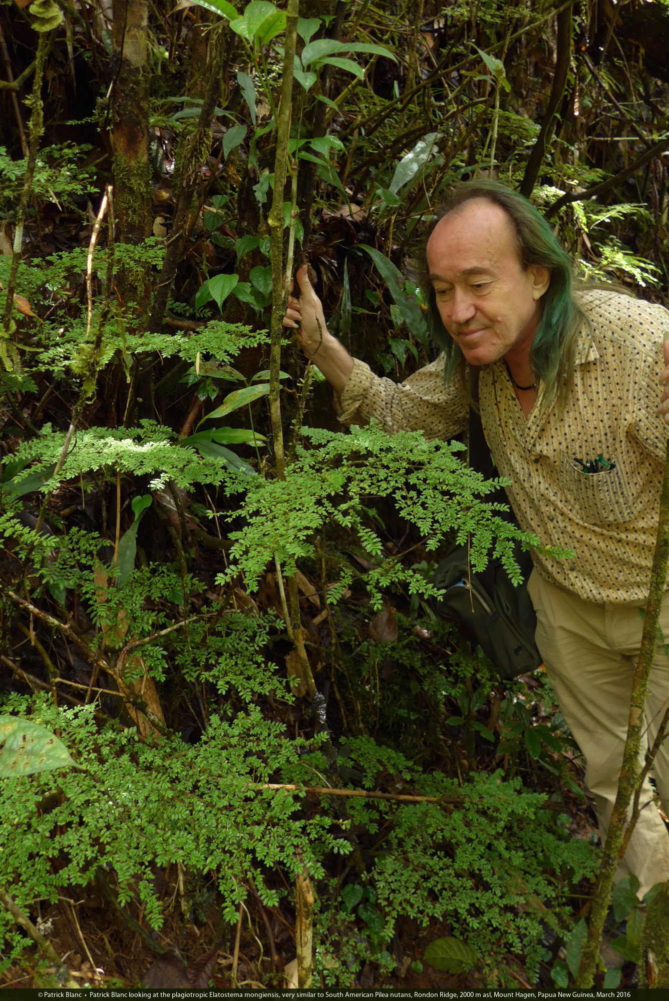 Patrick Blanc looking at the erect plagiotropic much branched Elatostema mongiensis, Rondon Ridge, 2000 m asl, Mount Hagen, Papua New Guinea, March 2016