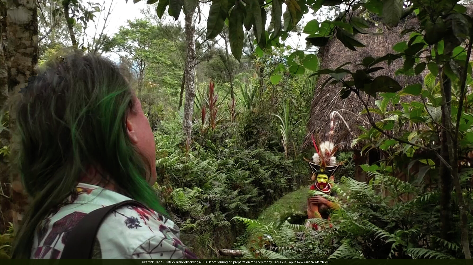 Patrick Blanc observing a Huli Dancer during his preparation for a ceremony, Tari, Hela, Papua New Guinea, March 2016