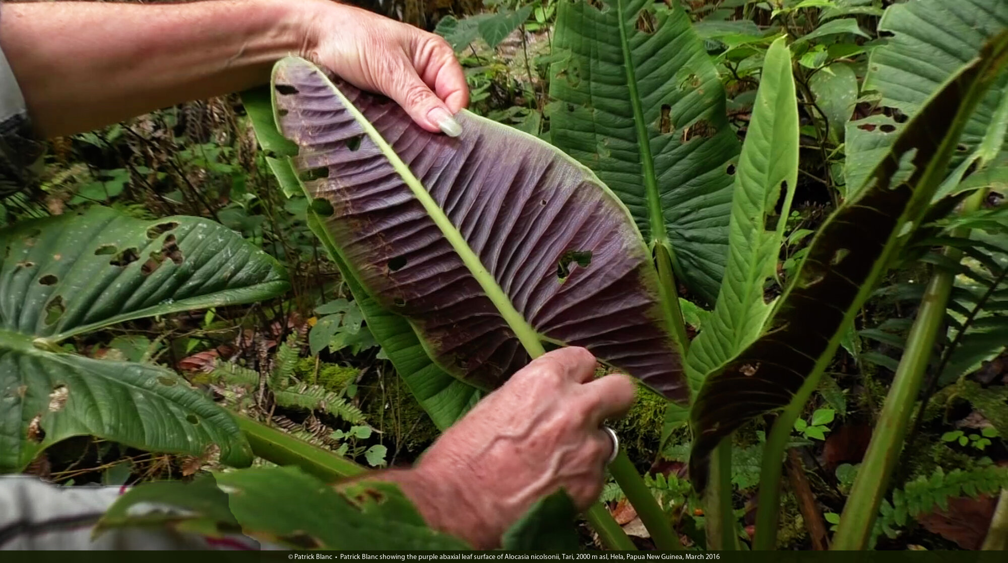 Patrick Blanc showing the purple abaxial leaf surface of Alocasia nicolsonii, Tari, 2000 m asl, Hela, Papua New Guinea, March 2016