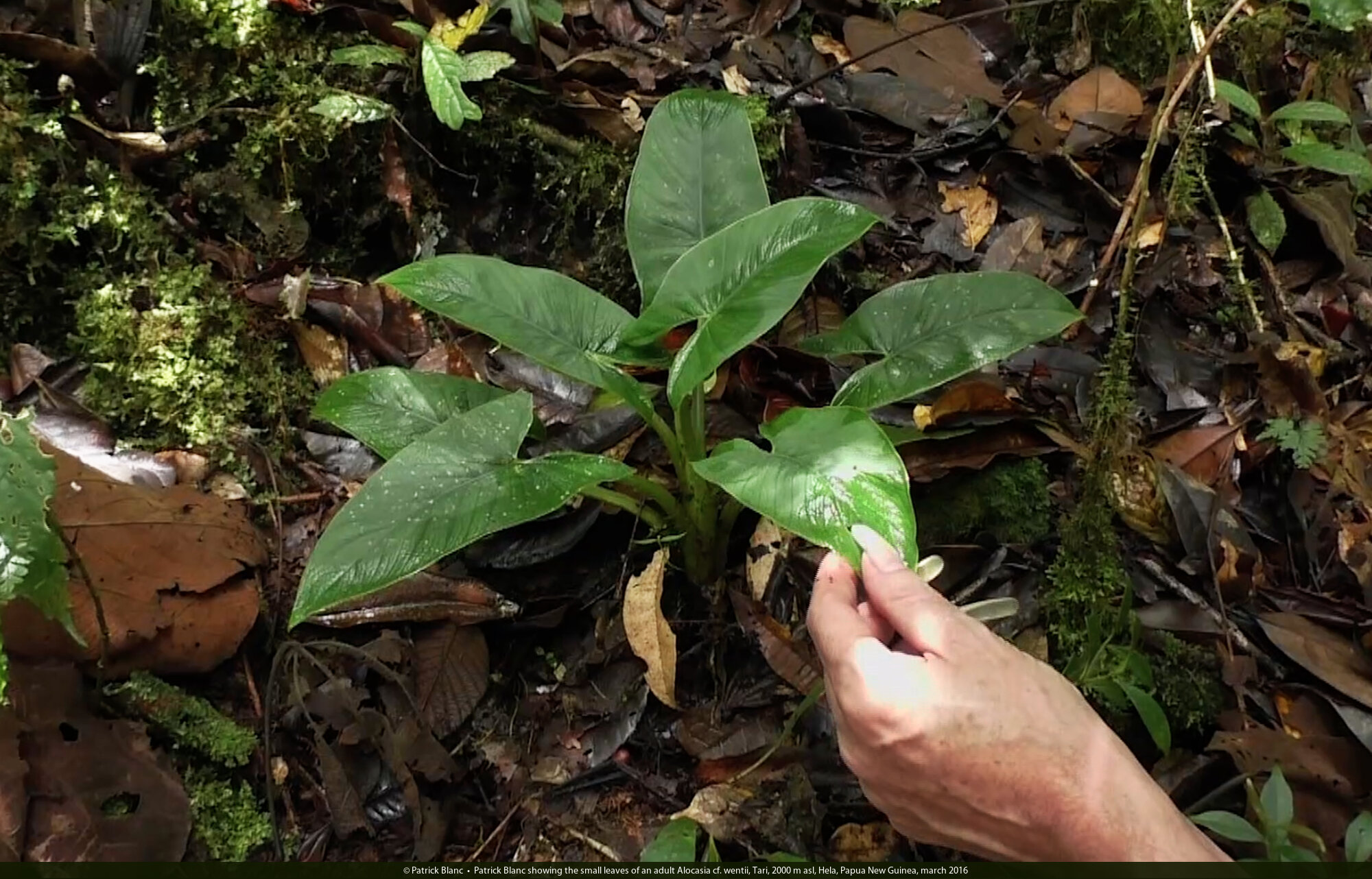 Patrick Blanc showing the small leaves of an adult Alocasia cf. wentii, Tari, 2000 m asl, Hela, Papua New Guinea, march 2016