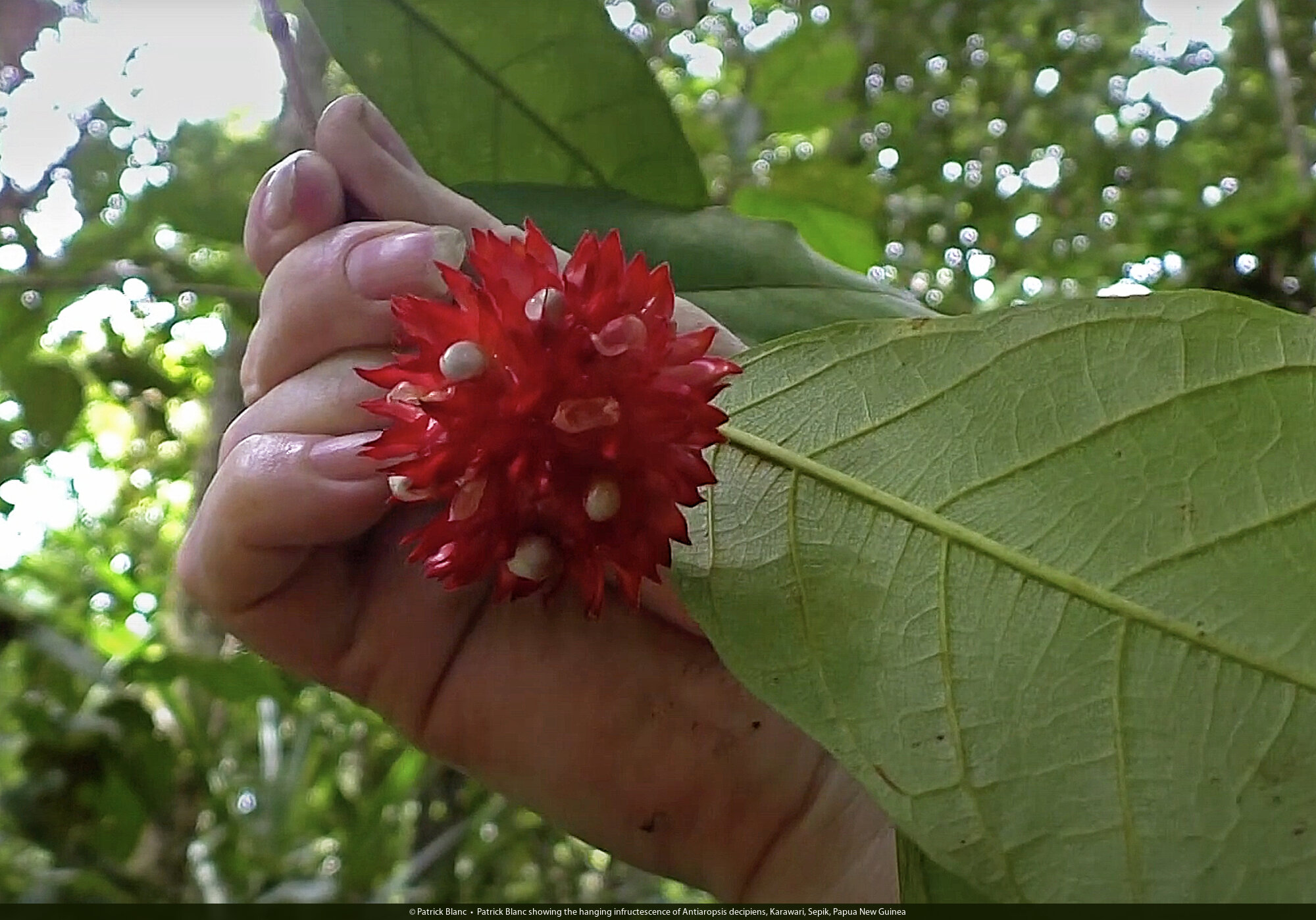 Patrick Blanc showing the hanging infructescence of Antiaropsis decipiens, Karawari, Sepik, Papua New Guinea