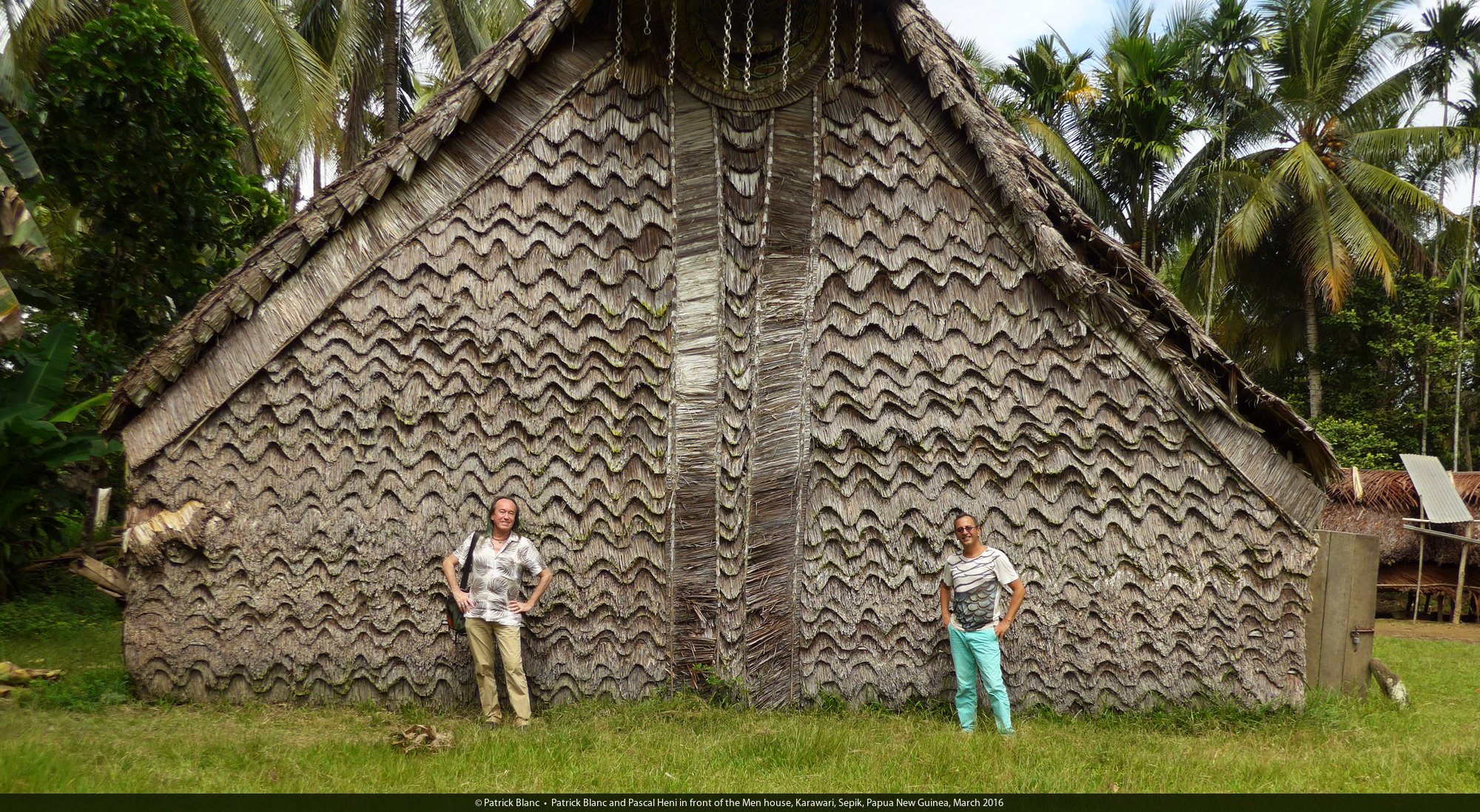 Patrick Blanc and Pascal Heni in front of the Men house, Karawari, Sepik, Papua New Guinea, March 2016