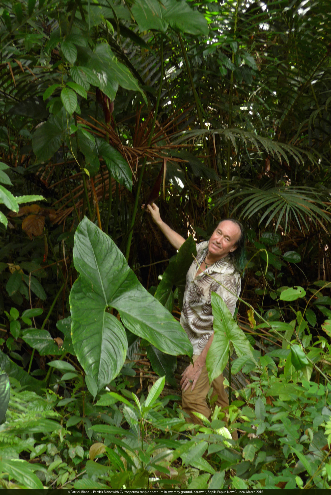 Patrick Blanc with Cyrtosperma cuspidispathum in swampy ground, Karawari, Sepik, Papua New Guinea, March 2016
