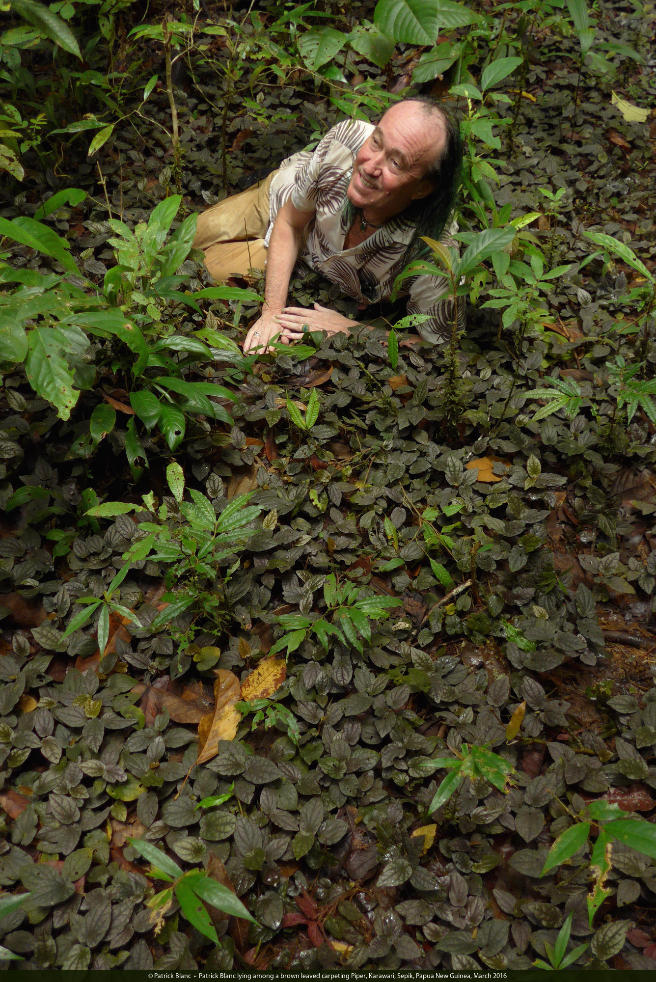 Patrick Blanc lying among a brown leaved carpeting Piper, Karawari, Sepik, Papua New Guinea, March 2016