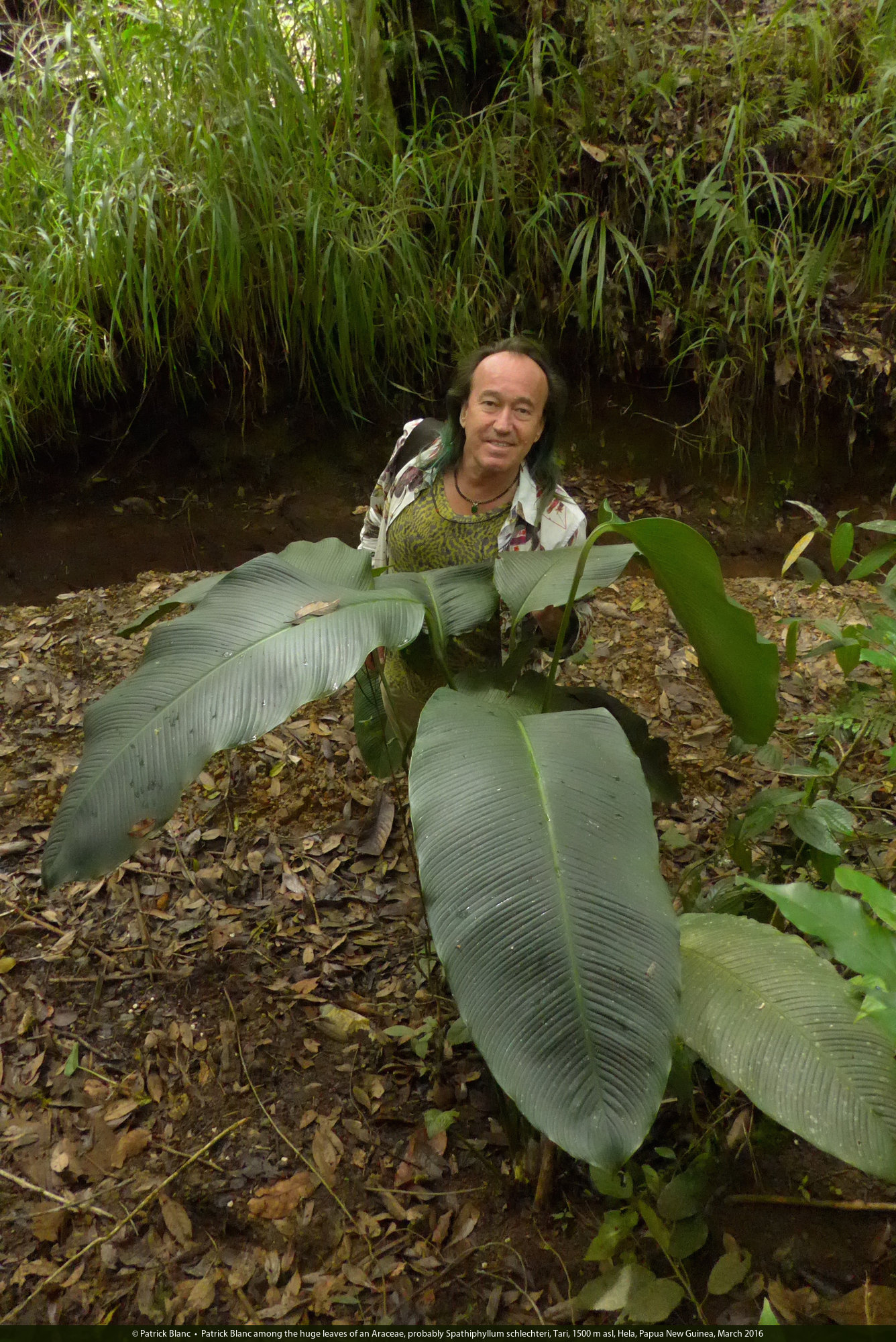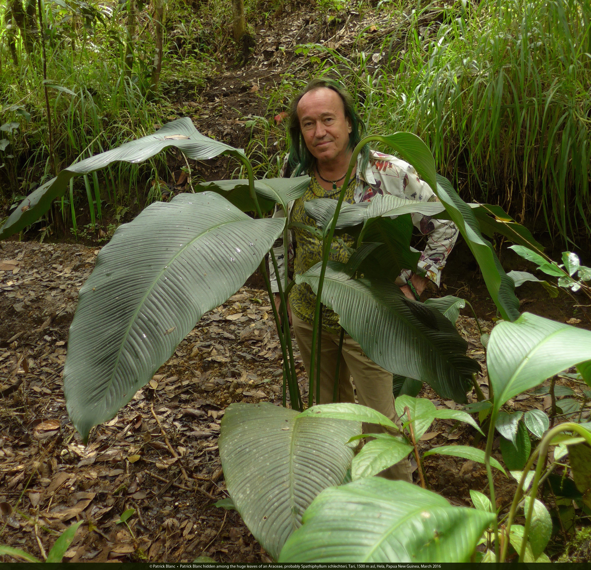 Patrick Blanc among the huge leaves of an Araceae, probably Spathiphyllum schlechteri, Tari, 1500 m asl, Hela, Papua New Guinea, March 2016