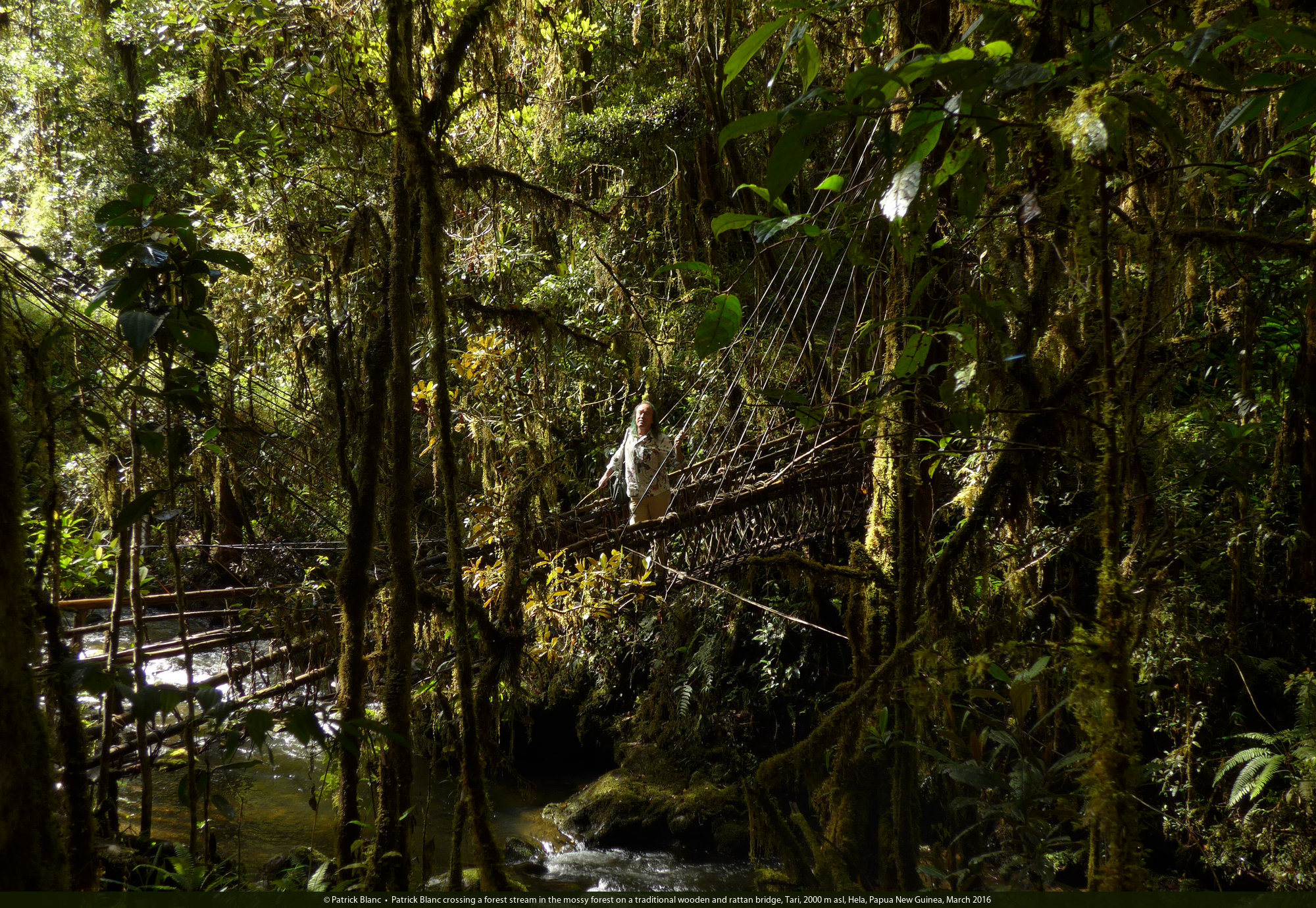 Patrick Blanc crossing a forest stream in the mossy forest on a traditional wooden and rattan bridge, Tari, 2000 m asl, Hela, Papua New Guinea, March 2016