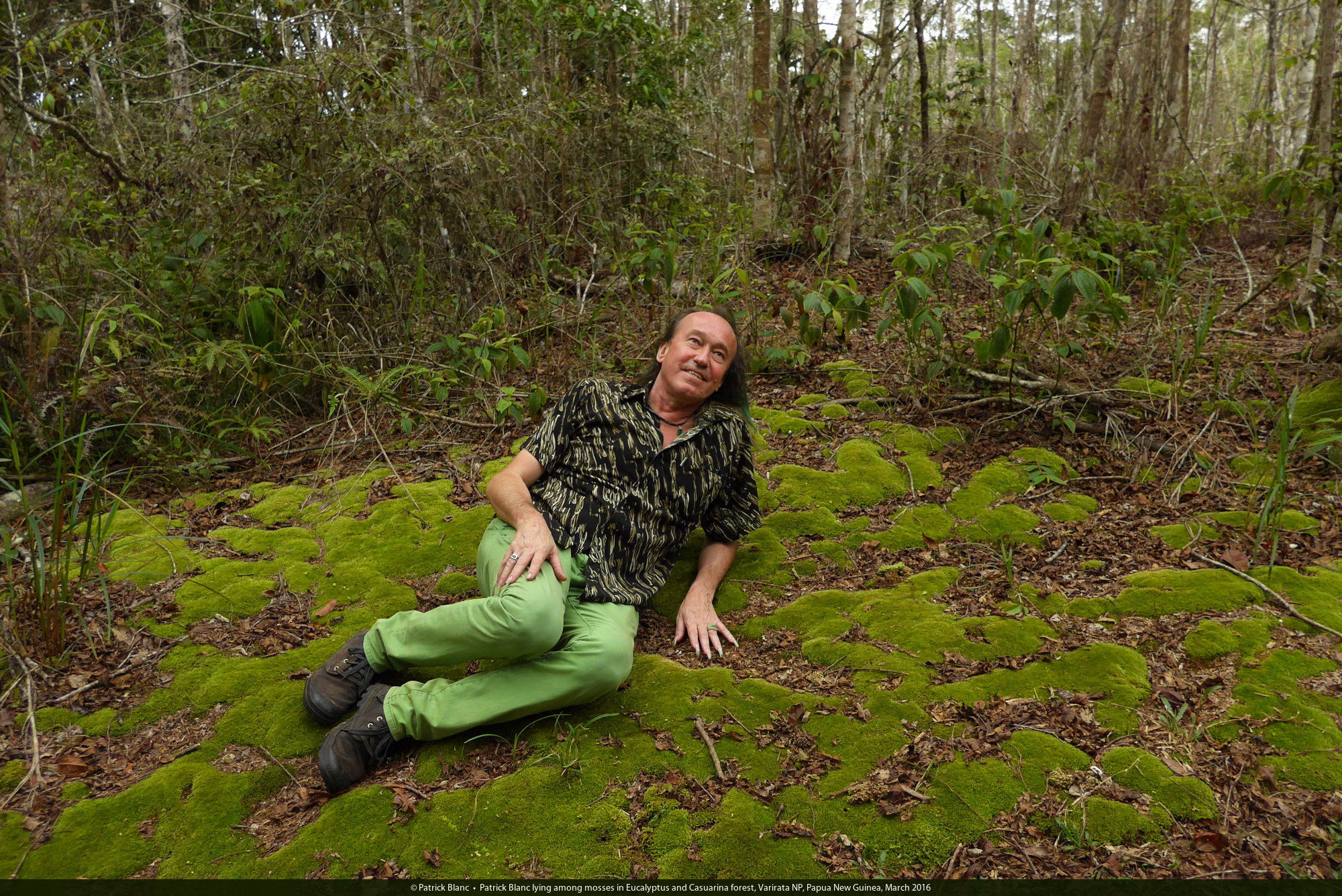 Patrick Blanc lying among mosses in Eucalyptus and Casuarina forest, Varirata NP, Papua New Guinea, March 2016