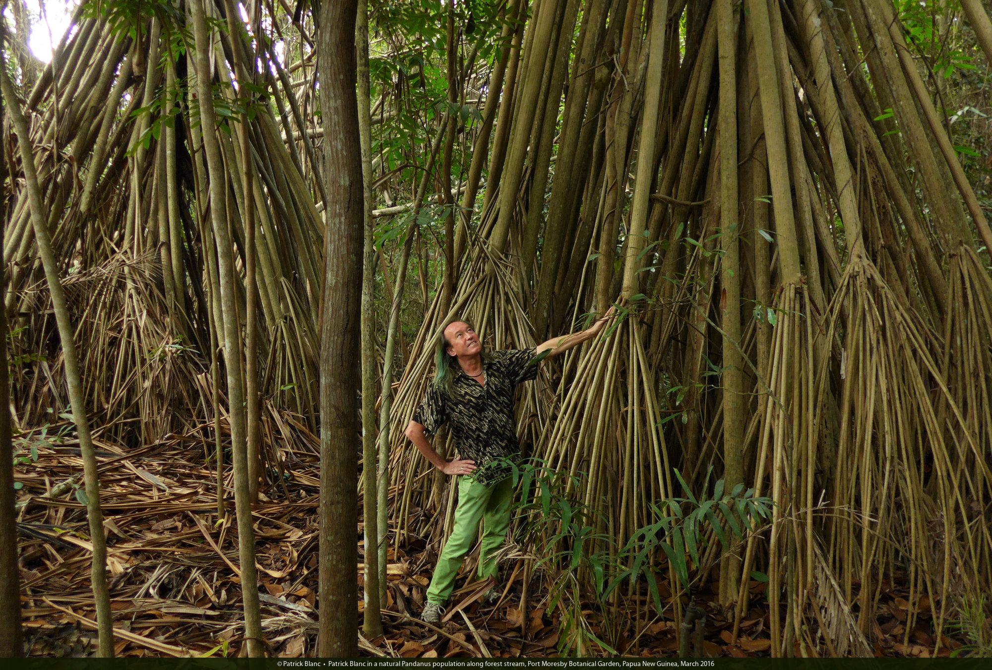 Patrick Blanc in a natural Pandanus papuanus population along forest stream, Port Moresby Botanical Garden, Papua New Guinea, March 2016