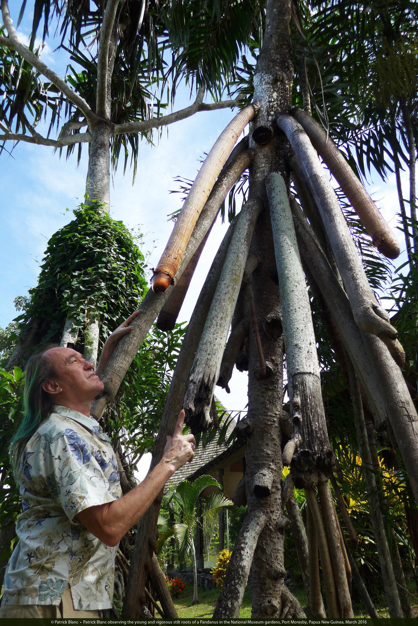 Patrick Blanc observing the young and vigorous stilt roots of a Pandanus papuanus in the National Museum gardens, Port Moresby, Papua New Guinea, March 2016.jpg