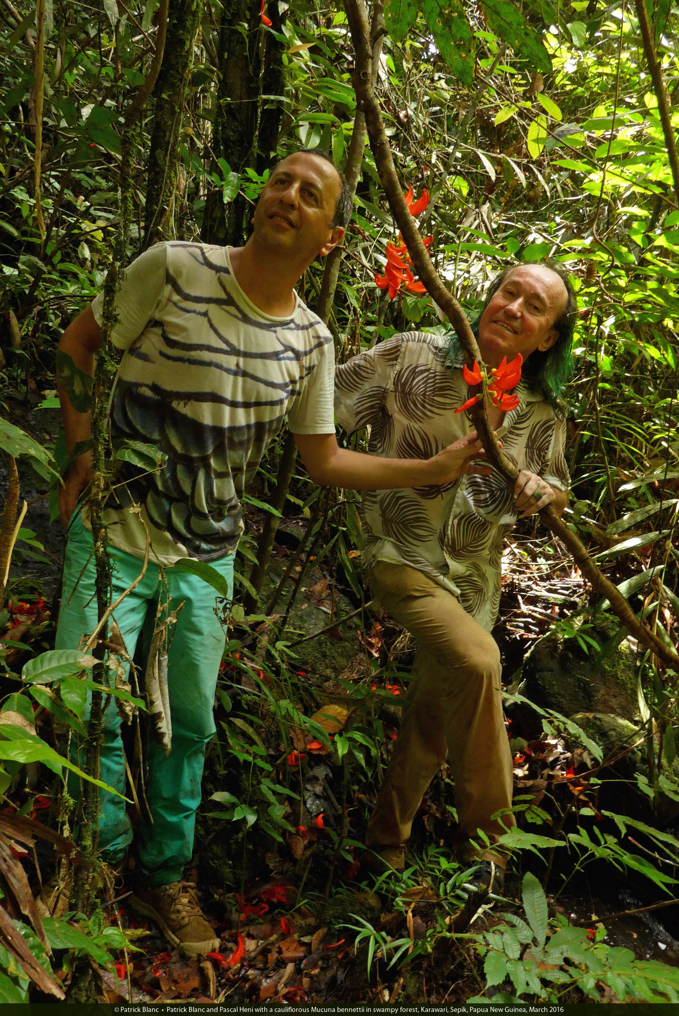 Patrick Blanc and Pascal Heni with a cauliflorous Mucuna bennettii in swampy forest, Karawari, Sepik, Papua New Guinea, March 2016