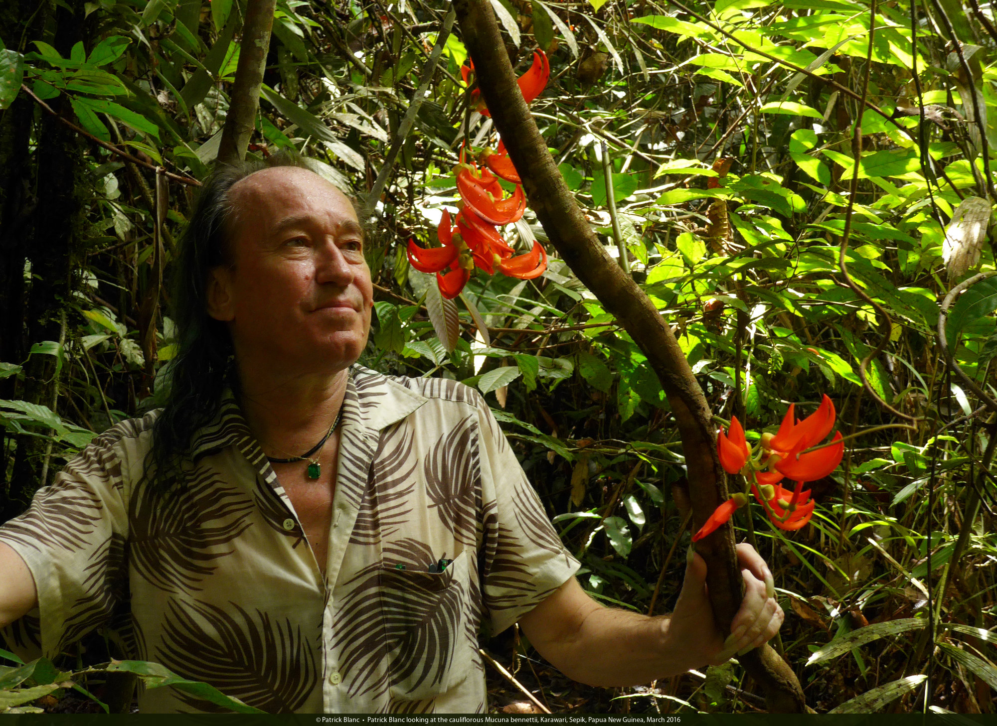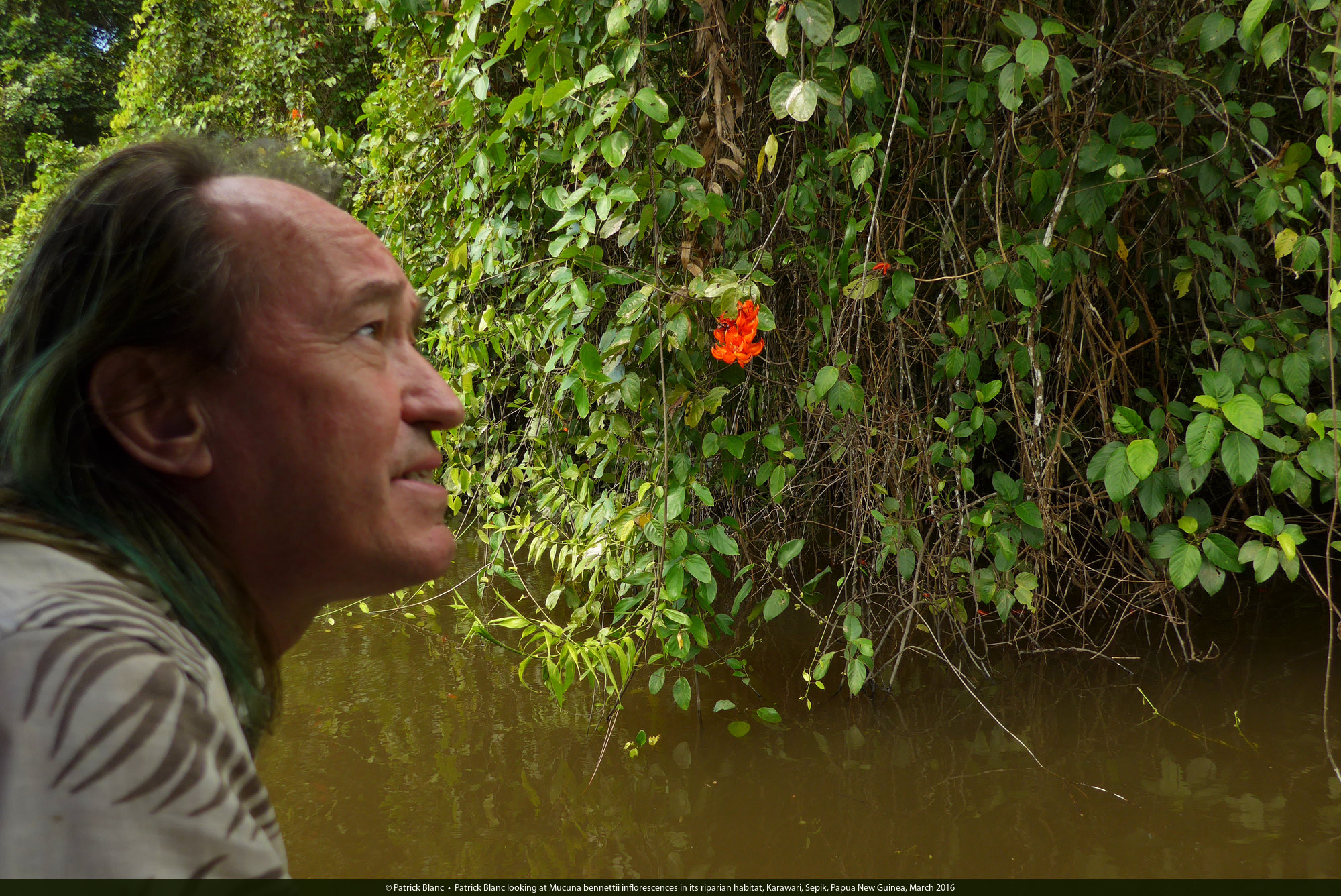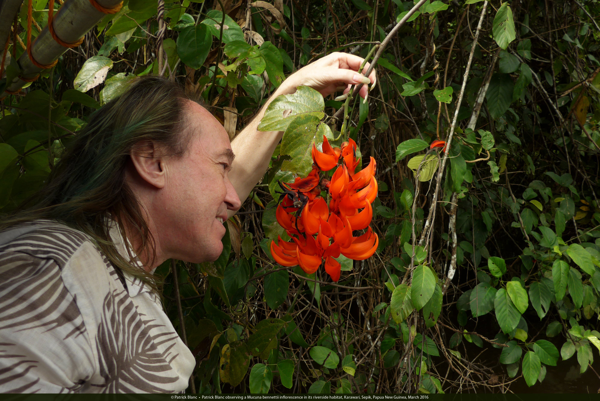 Patrick Blanc observing a Mucuna bennettii inflorescence in its riverside habitat, Karawari, Sepik, Papua New Guinea, March 2016