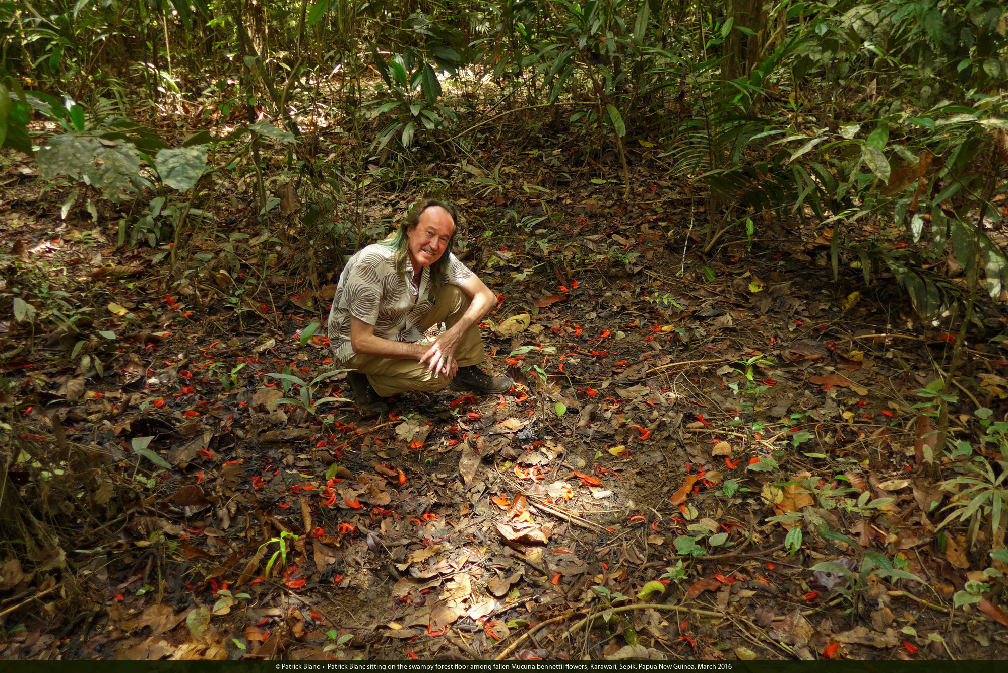 Patrick Blanc sitting on the swampy forest floor among fallen Mucuna bennettii flowers, Karawari, Sepik, Papua New Guinea, March 2016
