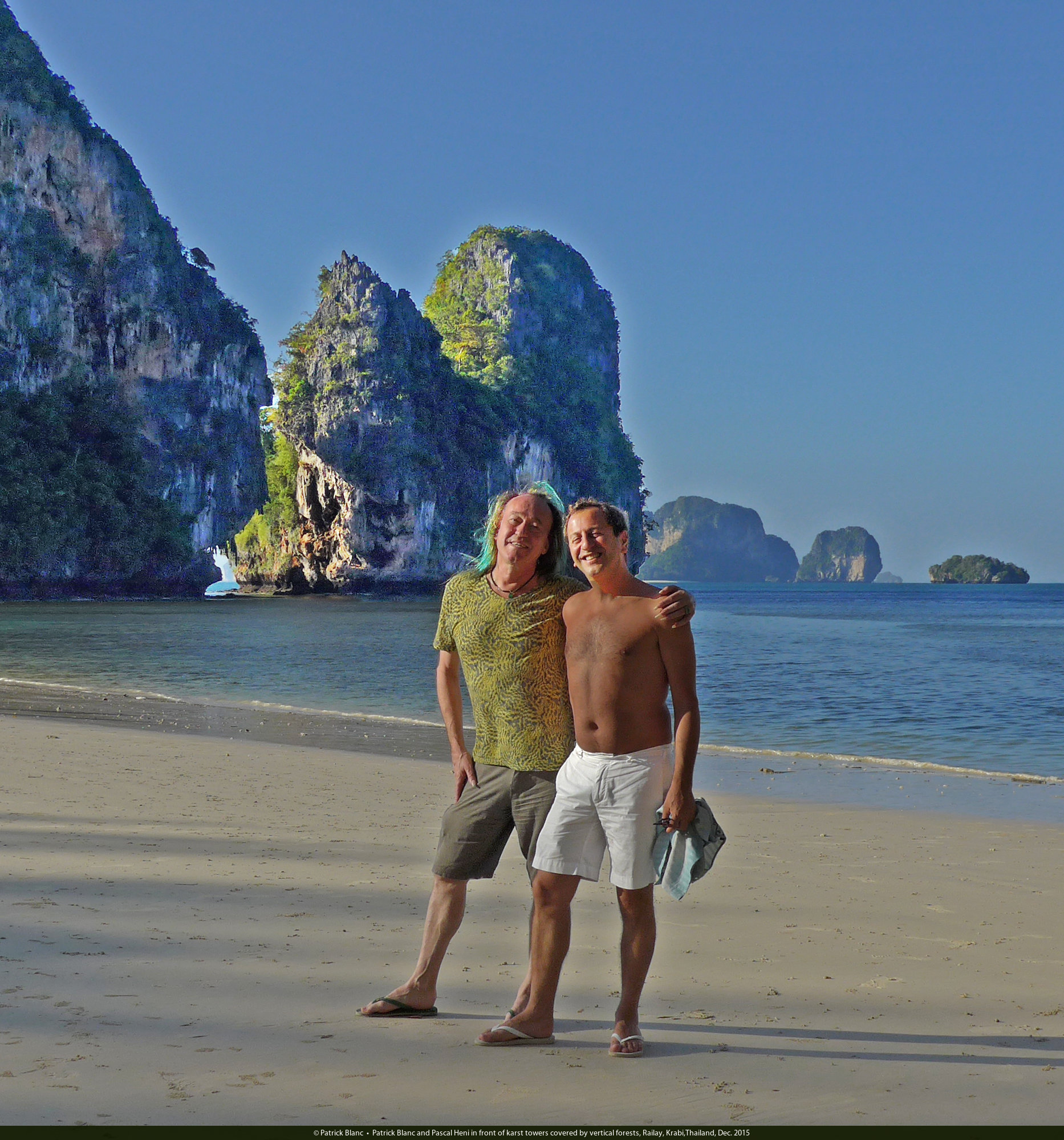 Patrick Blanc and Pascal Heni in front of karst towers covered by vertical forests, Railay, Krabi,Thailand, Dec. 2015