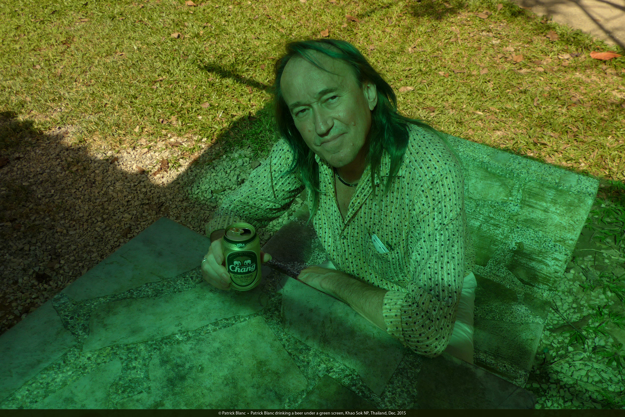Patrick Blanc drinking a beer under a green screen, Khao Sok NP, Thailand, Dec. 2015