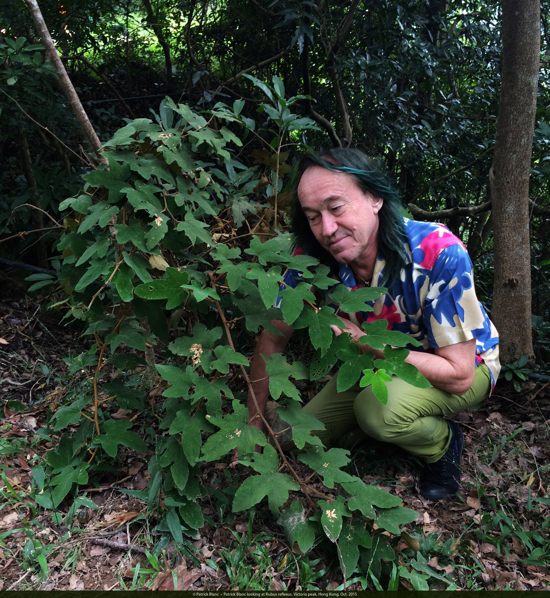 Patrick Blanc looking at Rubus reflexus, Victoria peak, Hong Kong, Oct. 2015