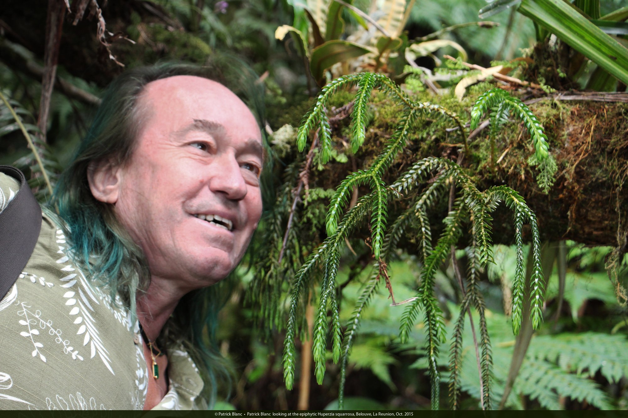 Patrick Blanc looking at the epiphytic Huperzia squarrosa, Belouve, La Reunion, Oct. 2015