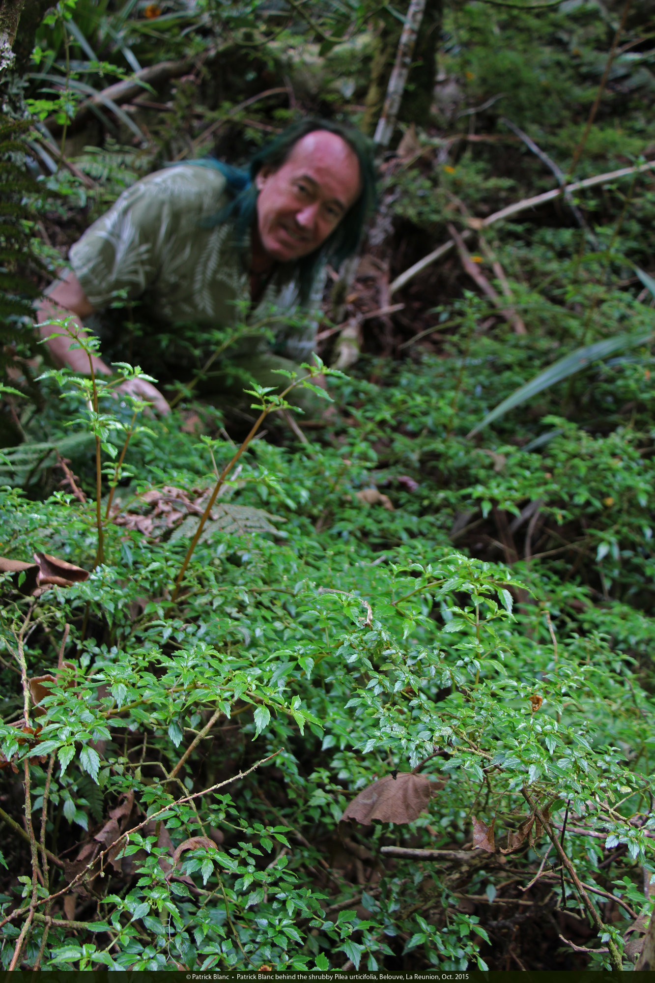 Patrick Blanc behind the shrubby Pilea urticifolia, Belouve, La Reunion, Oct. 2015