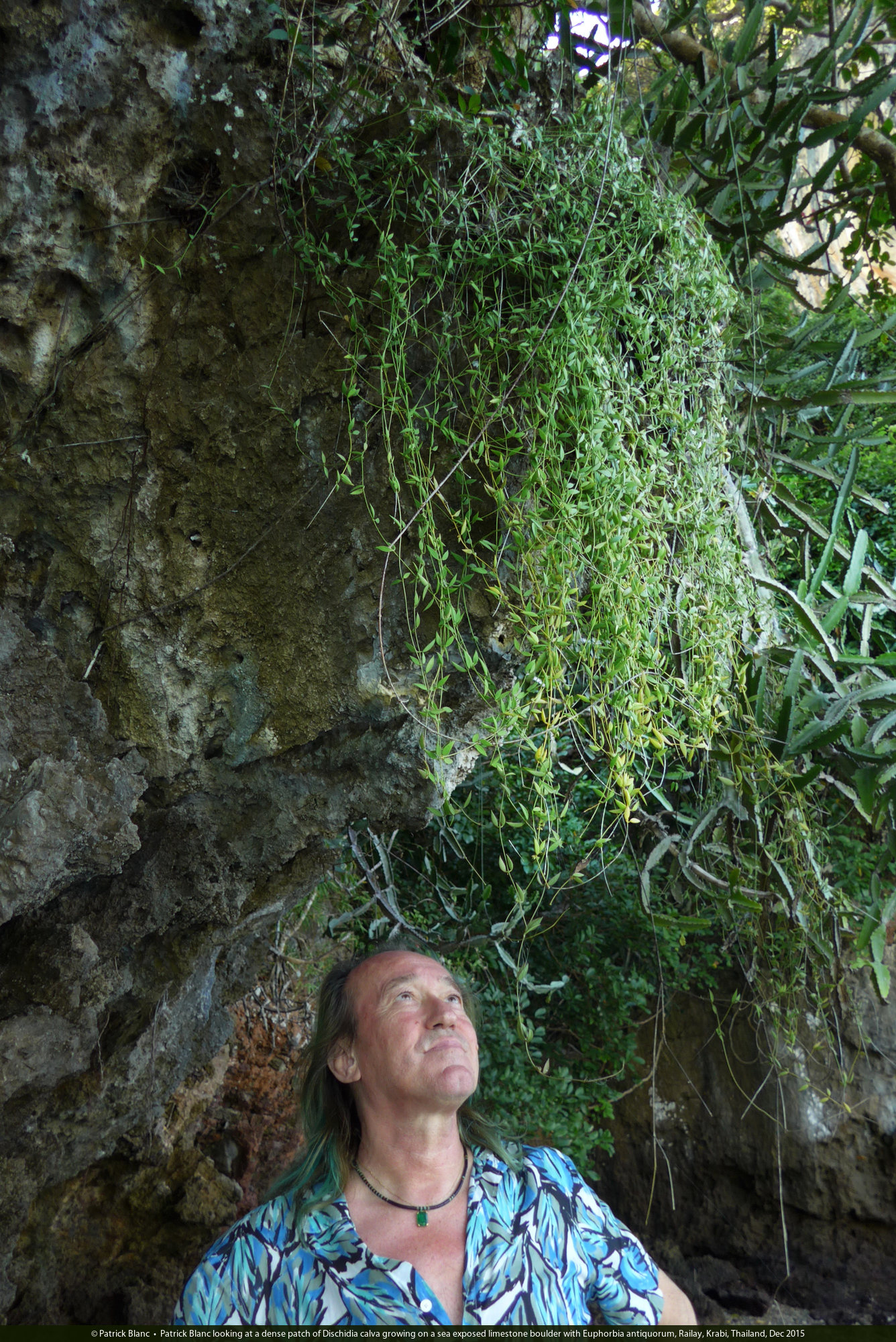 Patrick Blanc looking at a dense patch of Dischidia calva growing on a sea exposed limestone boulder with Euphorbia antiquorum, Railay, Krabi, Thailand, Dec 2015