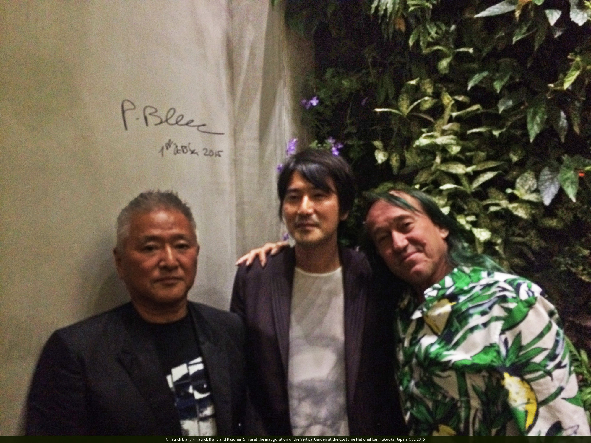 Patrick Blanc and Kazunari Shirai at the inauguration of the Vertical Garden at the Costume National bar, Fukuoka, Japan, Oct. 2015