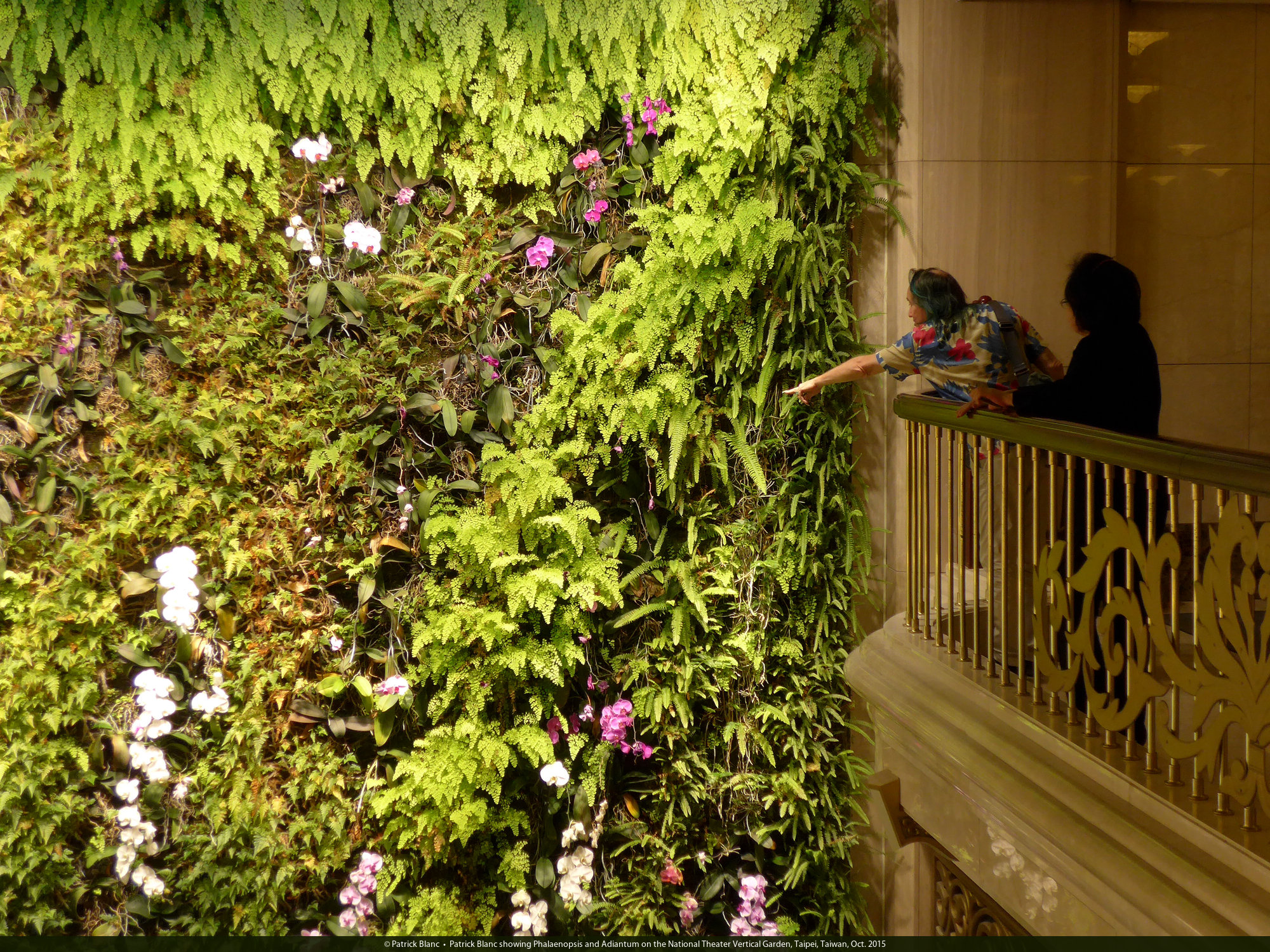 Patrick Blanc showing Phalaenopsis and Adiantum on the National Theater Vertical Garden, Taipei, Taiwan, Oct. 2015