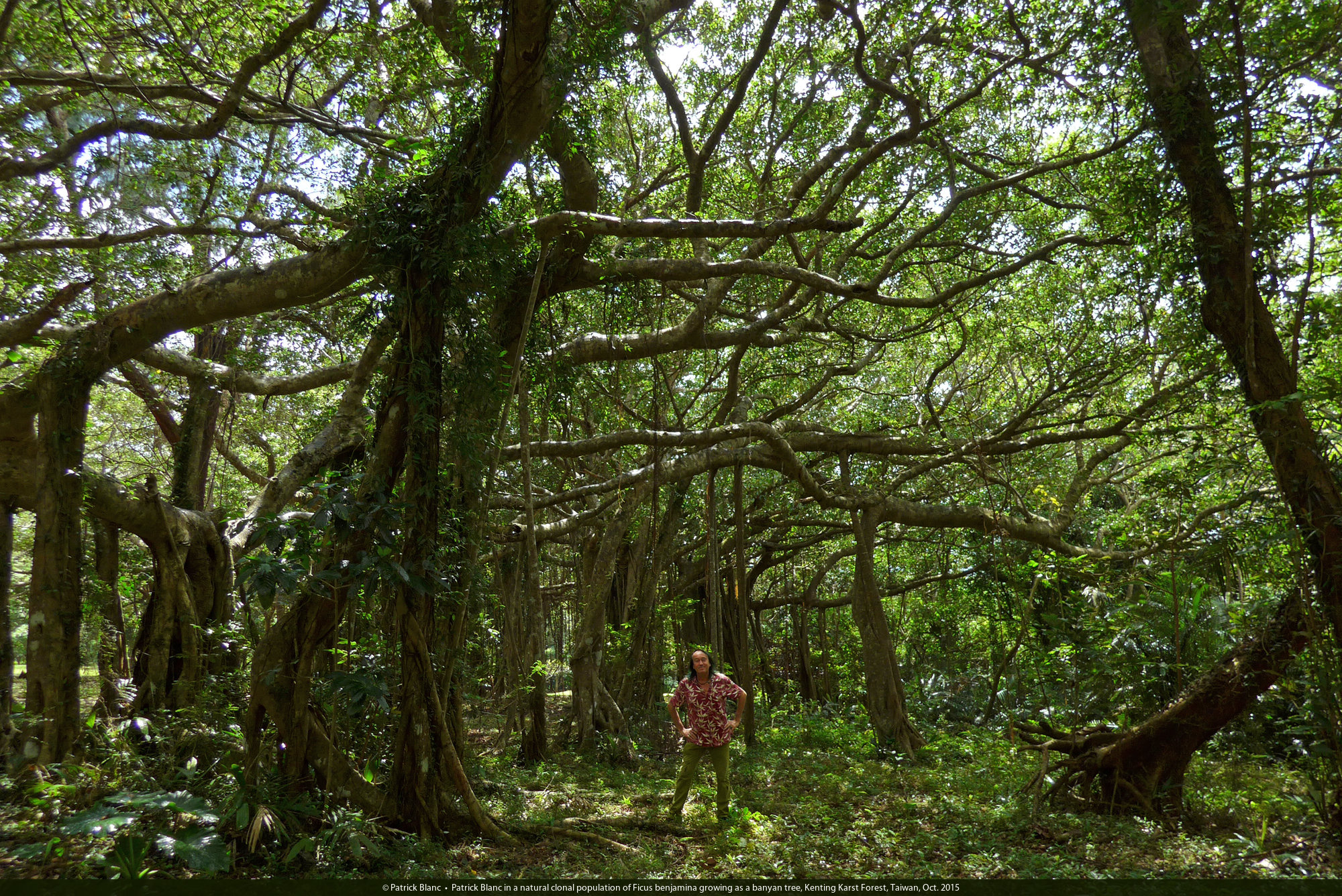 Patrick Blanc in a natural clonal population of Ficus benjamina growing as a banyan tree, Kenting Karst Forest, Taiwan, Oct. 2015