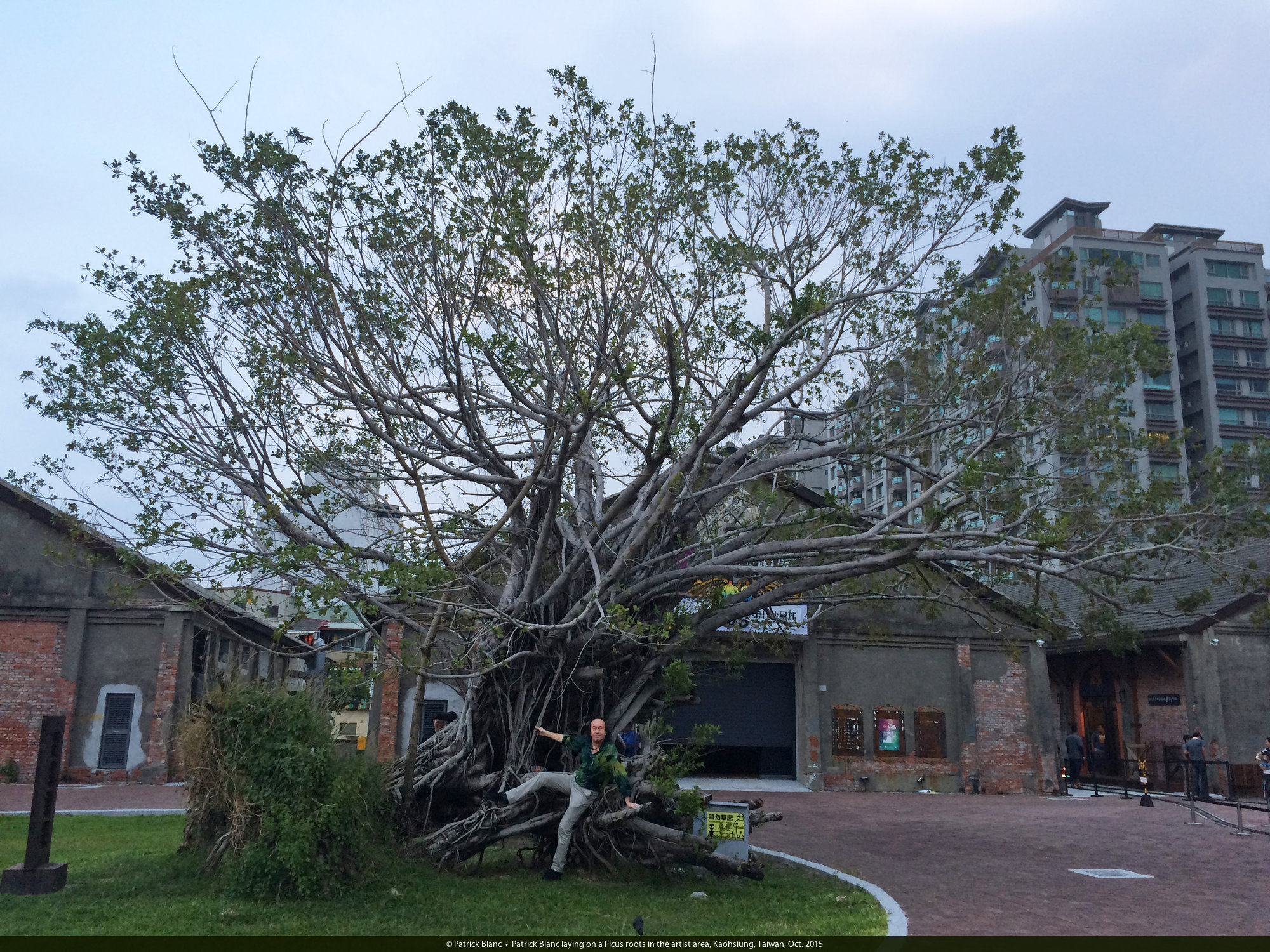 Patrick Blanc laying on Ficus roots in the artist area, Kaohsiung, Taiwan, Oct. 2015